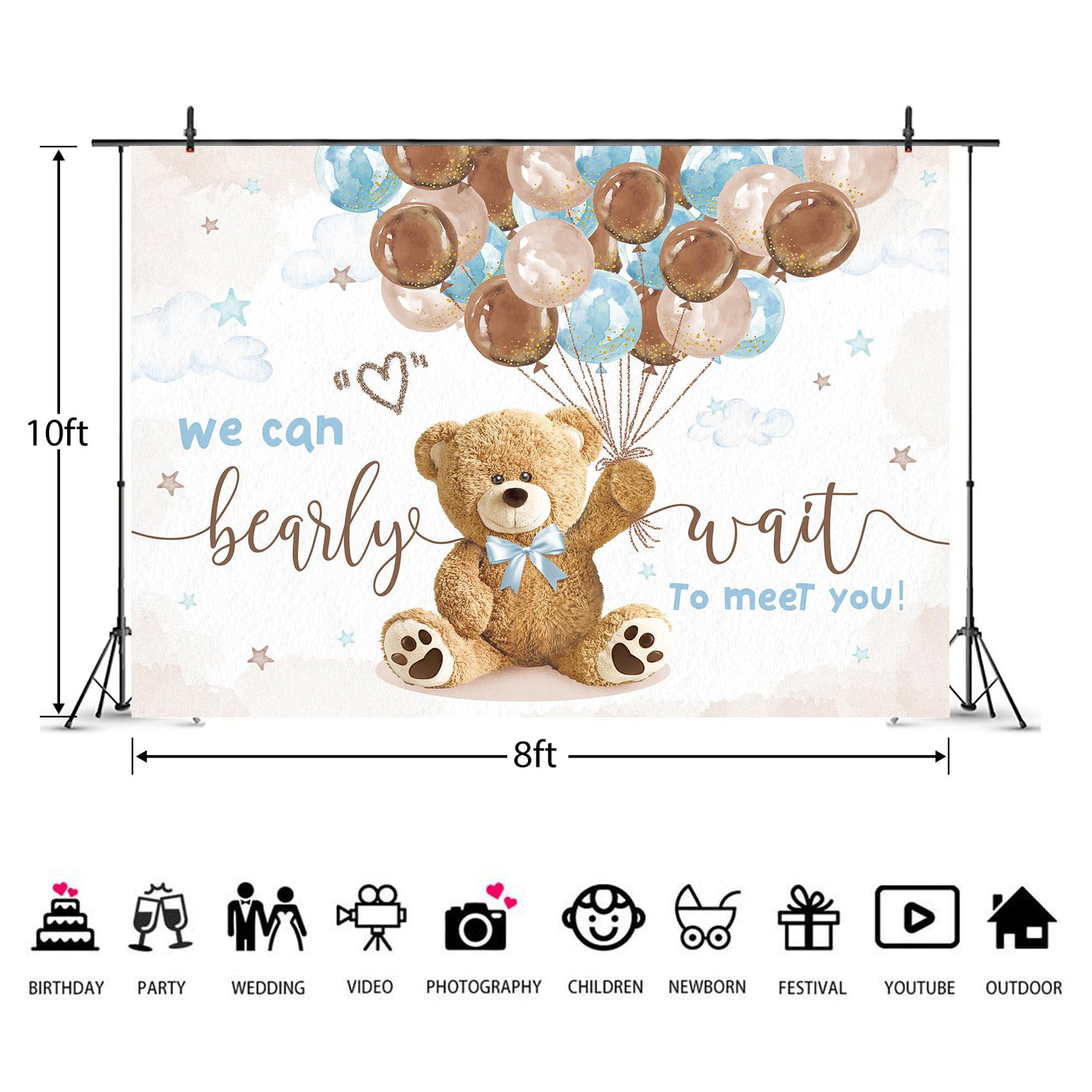 Imirell We Can Bearly Wait Backdrop 10Wx8H Feet Bear Baby Shower For Boys Cute Cartoon Brown Blue Balloons Clouds Gold Dots Viny