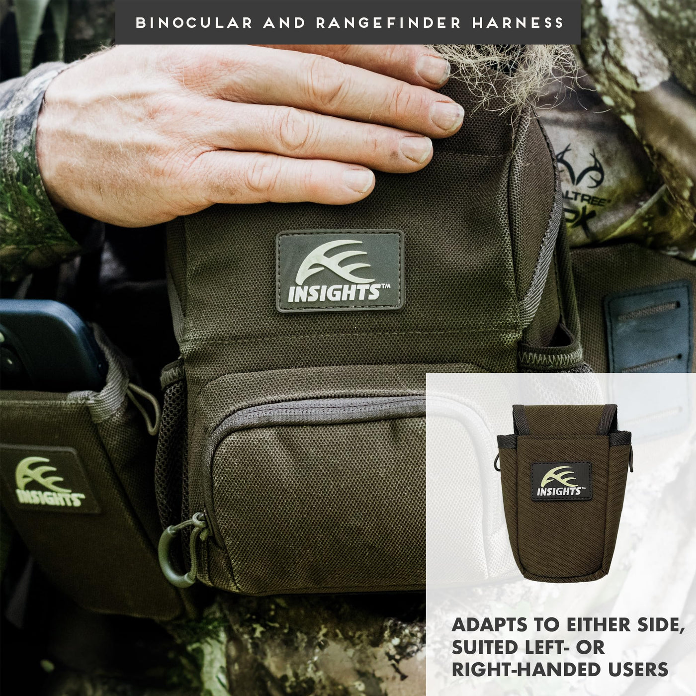 Q: Is the Insights Hunting harness suitable for both binoculars and range finders?A: Yes, the harness is designed to carry and protect both binoculars and range finders, with a dedicated range finder pouch measuring 3.5 x 2.5 x 5 inches.