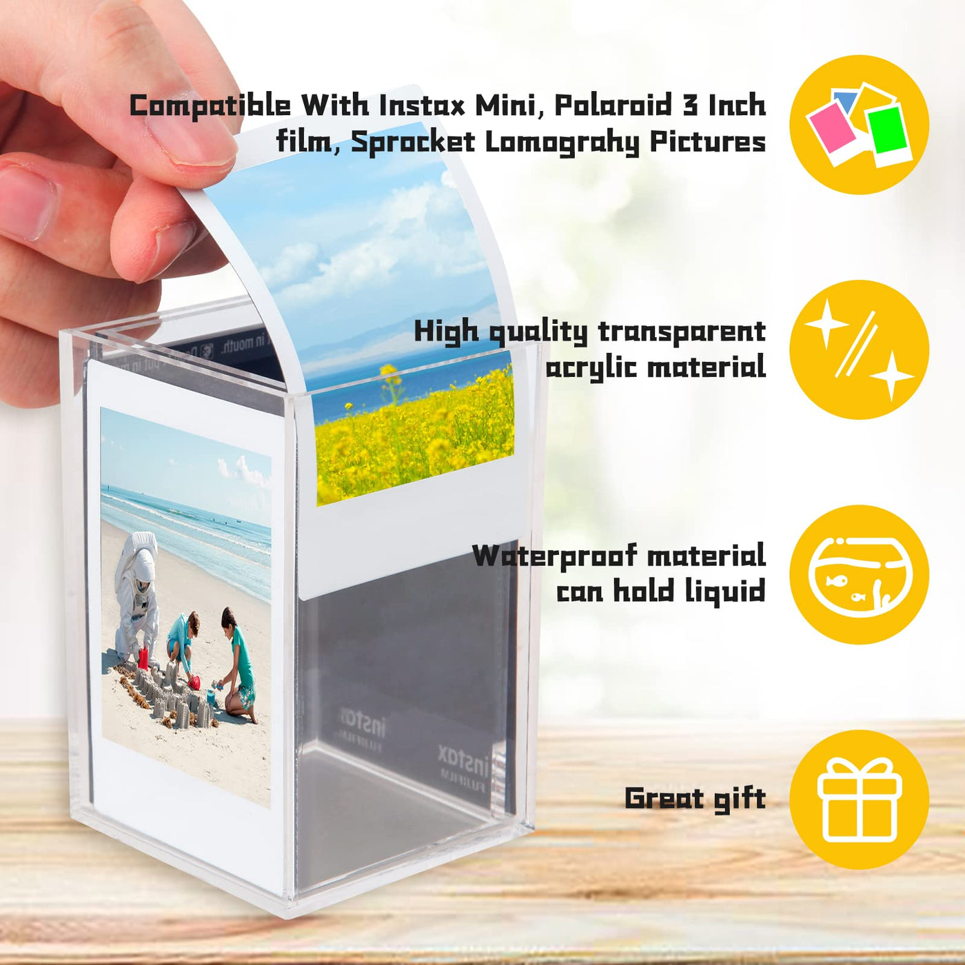 Instax Mini Photo Frame And Holder,Instax Mini Acrylic Picture Frame,Displays 4 Instant 54 Mm X 86 Mm Photos-For Instax Mini, Polaroid, Lomography, Sprocket Photos-4 Sided Photo Cube, Pen Holder,Desk Accessories Holder,Makeup Brush Organizer, Water Plant Containers