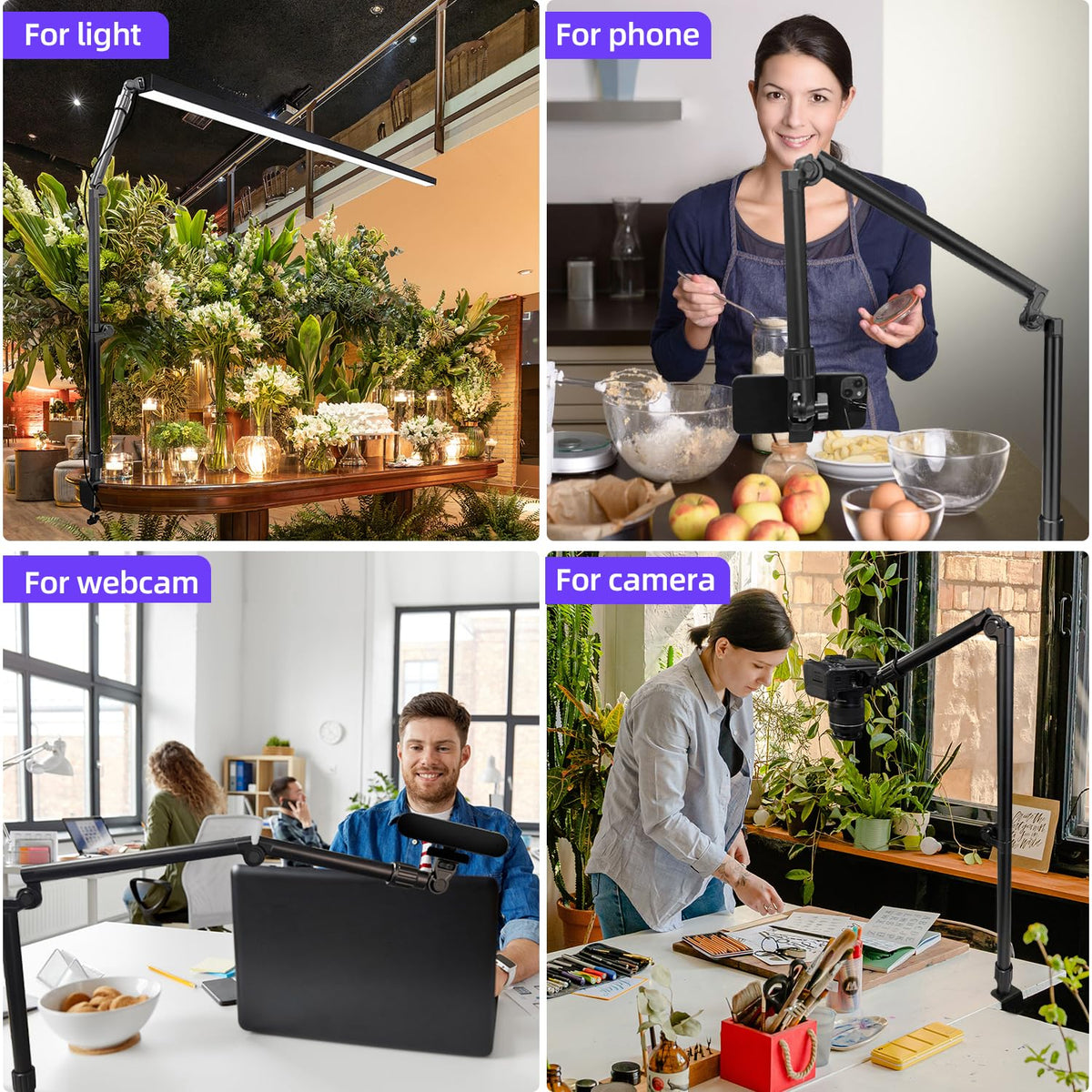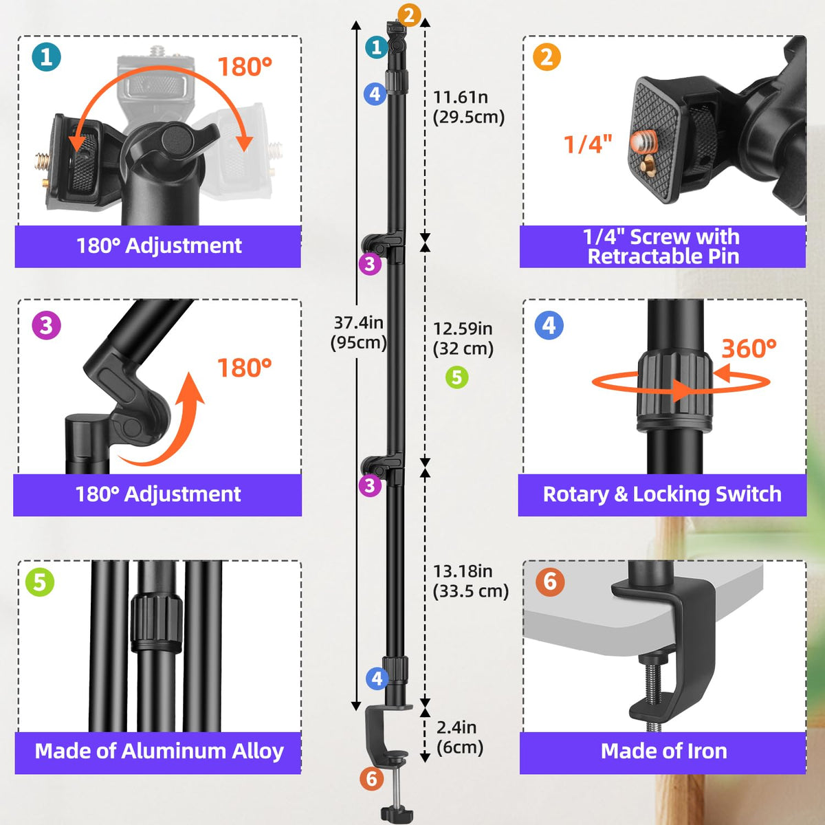 Jinsui 3-Section Mic Arm With Super Clamp For Webcam/ Camera/ Projector/ Microphone/ Phone/ Ring Lightdesigned For Performance, Jinsui Webcam Stand Is Made Of High-Strength Aluminum Alloy For Durability And C Clamp Is Made Of Iron. The Top And Bottom Of The Boom Arm Are 360 Rotatable. You Can Tilt Or Rotate The Overhead Camer Mount Stand For Comfortable Angle. Included Cable Ties Keep Your Cords Off Your Desktop For Better Organization.The Camera Desk Mount Is Ideal For Families, Stages, Studios, Broadcasting And Tv Stations, Adding Better Experience For Live Stream, Singing, Broadcast, Photoshoot, And More.Universal 1/4'' Screw:Fit For Camera, Webcam, Projector, Gopro, Phone Mount, Ring Light, Fill Light Etc.C-Clamp Mount, Larger Clamping Distance:0-60Mm Clip Spacing, Suitable For Most Desktops On The Market. The C-Shaped Bottom Clip Is Glued To The Top And Bottom Of The Mesh Silica Gel, Which Can Protect The Desktop And Increase Friction, The Clamp Is Tighter And It Is Easy To Disassemble.Phone Holder With Cold Shoe:The Phone Holder With A Cold Shoe Provides Extra Convenience And Can Hold A Blue Yeti Snowball Microphone Or Other Devices To Use At The Same Time.Related Keywords: Webcam Stand For Desk, Overhead Camera Phone Mount, Camera Desk Mount, Overhead Camera Rig, Webcam Arm, Light Stand, Magic Arm