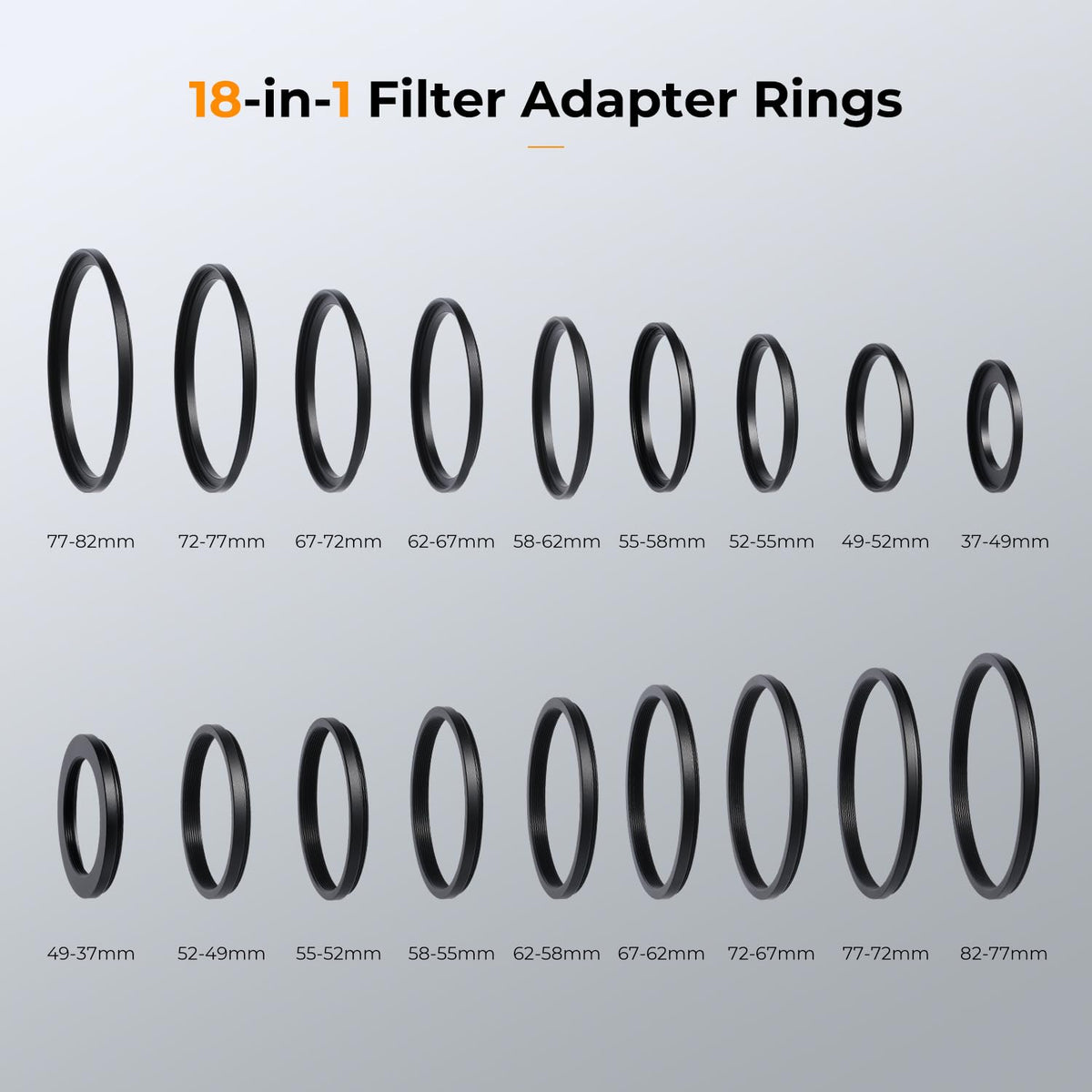 - Step-down Rings: 82-77mm, 77-72mm, 72-67mm, 67-62mm, 62-58mm, 58-55mm, 55-52mm, 52-49mm, 49-37mm