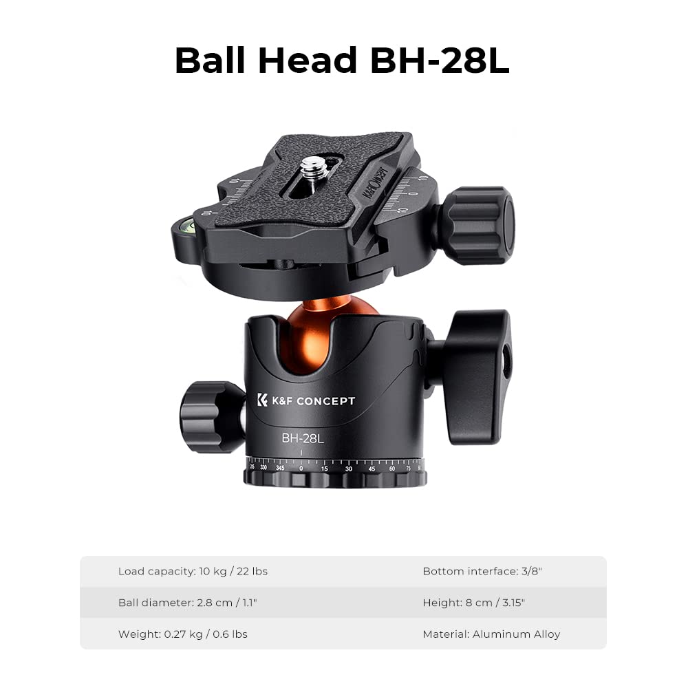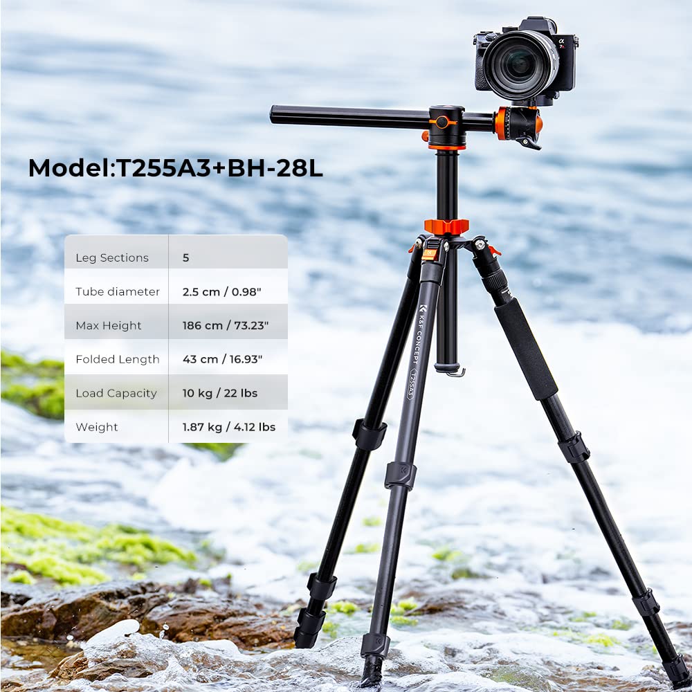 K&F Concept 73 Inch /186Cm Camera Tripod,Transverse Center Column Aluminium Dslr Tripod With 360 Degree Ball Head 10Kg Load Capacity,Quick Release Plate,Detachable Monopod T255A3+Bh 28L
