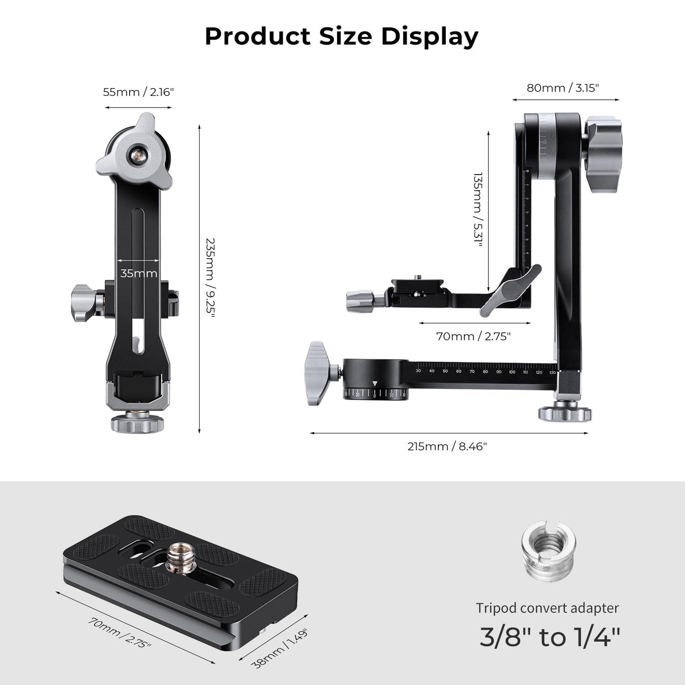 ?Smoother?Our Exclusive Lubricant, With Optimal Viscosity And Enhanced Consistency, Ensures Silky-Smooth Rotation Even In Extreme Temperatures. | ?Craftsmanship Upgrade?Introducing A New Cnc Process For Enhanced Precision And Durability. Constructed From Premium Aluminum Alloy, Including Components Like Knobs. It Supports A Weight Capacity Of 44.09Lbs/20Kg And Weighs Only 1.13Kg, 11% Lighter Than The Previous Version. | ?More Power, More Precision?4 Adjustable Modes Allow For 360-Degree Horizontal And Vertical Rotation, With 100Mm Range For Horizontal And Vertical Adjustment Of The Arm. Each Adjustment Point Features Precise Scales, And The Robust Damping Locking Force Can Hold Large Cameras At Any Angle. | ?Wide Compatibility?Compatible As Long As The Tripod Screws Are 3/8 '' Or 1/4 ''. Compatible If The Camera Or Other Device Has A 1/4 '' Or 3/8 '' Bottom Thread. This Gimbal Head Includes Screw Adapters And A Quick-Release Plate. | ?Usage Recommendation?Perfect For Expensive And Heavy Cameras, Long Telephoto Lenses, And Capturing Shots From Multiple Angles. A Photographer'S Best Friend, Especially For Professionals.
