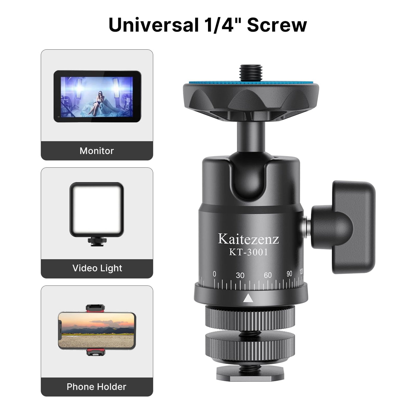 Kaitezenz Mini Ball Head, Panoramic Camera Tripod Head With 1/4'' Screw And Dual Hot Shoe Mount, 360 Rotatable Metal Adapter For