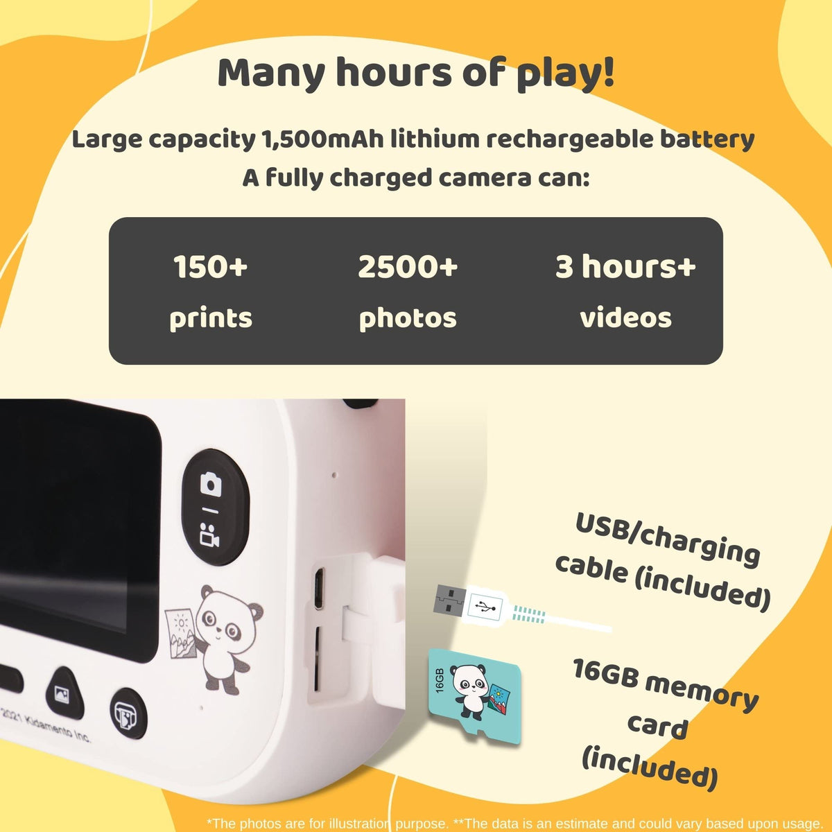 Why Kidamento Kids Digital Camera?? Recommended By Top Us And Canadian Children And Family Photographers. ? Extremely Low Printing Paper Cost ~ $0.05 Vs. $1 Per Picture Of Traditional Polaroid Cameras.? It Is Also A Digital Camera And Video Recorder. Most Polaroid Can Do Instant Print Only. ? Proudly Toronto Based Company Run By A Passionate Team.? Hassle-Free Care And Warranty Policy.? Well-Known Top-Notch Customer Service That You Deserve.? Fully Tested To Comply With Applicable International Standards.? 100% Quality Inspection Before Leaving Our Factory Floor And Warehouse.Specificationsphoto Resolution (Rear And Front): 4,032 X 2,880 (Interpolated)Video Resolution (Rear And Front): 1,080 X 720Size: L12 X W7 X H8 Cm Weight: 230G (0.5Lb)Battery Size/Type: 1,500Mah / Lithium Ion Polymer Rechargeable Batterycharging: Dc 5V-1A, Charge With The Usb Cable Includedlanguage: English, French, Spanish, Simplified Chinese, Traditional Chinese, Japanese, Korean, German, Italian, Portuguese, Arabic Compatible Storage Media: Up To 16Gb Tf/Microsd Card (A Free 16Gb Kidamento Memory Card Is Included In The Camera Package)In The Box1 X Model P Koko Instant Print Camera1 X Kidamento 16Gb Memory Card1 X Usb Cable/Charging Cable1 X Kidamento Koko Style Lanyard/Neck Strap1 X Scavenger Hunt Photobook1 X Printing Paper Sticker Roll1 X Sticker Sheet1 X User Manual1 X Wifi Instruction Card1 X Warranty Card