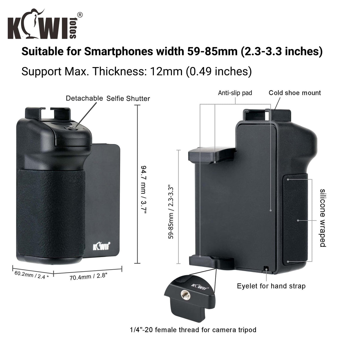 The Kiwifotos Wireless Remote Phone Grip Is Specially Designed For Vlog Shooting, Live Streaming, Taking Selfies Or Group Photos, Which Fits Mainstream Smart Phones From 59-85Mm / 2.3-3.3'' Wide. It Adopts Ergonomic Design And Allows You To Achieve Comfortable Hand Feeling And Better Shooting Experience. The Silicone Wrapped Grip Makes It Easy To Hold And Operate Smart Phones In One Hand, Grips Your Phone Like A Camera And Reduces Shaking When Taking Photos Or Recording Videos. The Cold Shoe Mount On The Top Of The Grip Allows You To Mount External Led Lamps Or Microphones. The 1/4''-20 Female Thread On The Bottom Enables You To Mount The Grip On A Stand Or Tripod To Realize Long Distance Shooting With The Included Wireless Remote Control. The Anti-Slip Pads On The Phone Holder Can Better Protect Your Phone, Making It Away From Scratches. Besides That, The Phone Grip Can Be Positioned Upright For Self-Standing Portrait Mode. In Addition, You Can Put The Lanyard In The Package Through The Eyelet On The Grip For Easy Carrying. The Grip Comes With A Detachable Wireless Remote Control (Powered By A Cr2025 Battery) And It Is Compatible With Ios And Android Systems At The Same Time. It Allows You To Take Selfies Or Group Photos Easily From A Distance Up To 10M / 32.8'. No Apps Needed To Download, Easily Connects To Your Smart Phone. This Detachable Wireless Remote Is Ideal For Taking Individual, Group Photos & Wide Angle Views. The Lightweight And Compact Design Of The Grip Makes It Easy To Pack In Your Backpack To Anywhere When You Need. Just Free Your Hands And Record Every Wonderful Moments In Your Life! Package Includes: Phone Grip X 1 Detachable Wireless Remote Control X 1 Cr2025 Battery X 1 Lanyard X 1