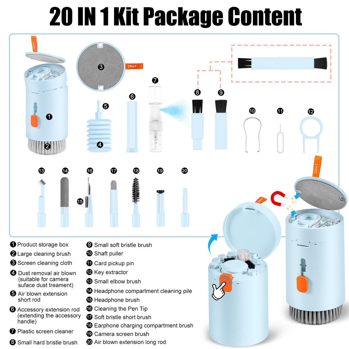 Specification 1. Product Storage Box 2. Large Cleaning Brush 3. Screen Cleaning Cloth 4. Dust Removal Air Blown 5. Air Blown Extension Short Rod 6. Accessory Extension Rod (Extending The Accessory Handle) 7. Screen Cleaner 8. Small Hard Bristle Brush 9. Small Soft Bristle Brush 10.Shaft Puller 11.Card Pickup Pin 12.Key Extractor 13.Small Elbow Brush 14.Headphone Compartment Cleaning Pile 15.Headphone Brush 16.Cleaning The Pen Tip 17.Soft Bristle Short Brsuh 18.Earphone Charging Compartment Brush 19.Cameta Screen Brush 20.Air Blown Extension Long Rod