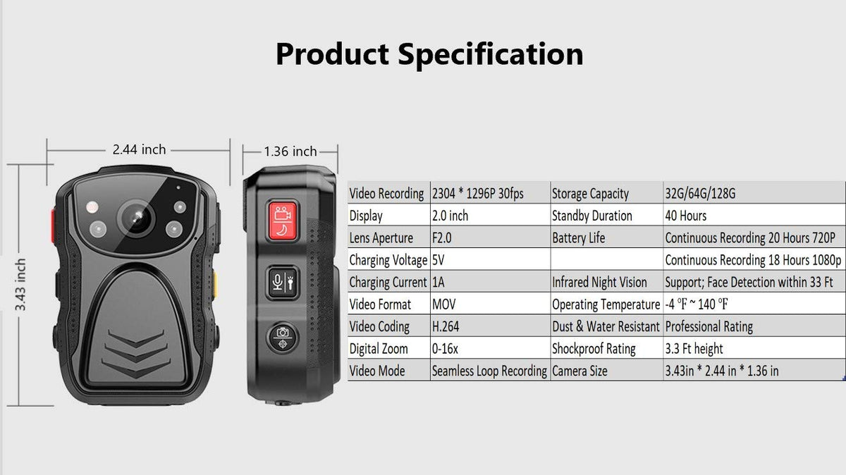 1296P (2034 X 1296) Infrared Night Vision Police Body Camera Body Worn Camera Security Ir Cam With 64Gb Built-In Memory Support Video/Audio Recording. (Please Read The Descriptions Before You Place An Order To Avoid Any Conflicts To Your Purpose Of Usage.)