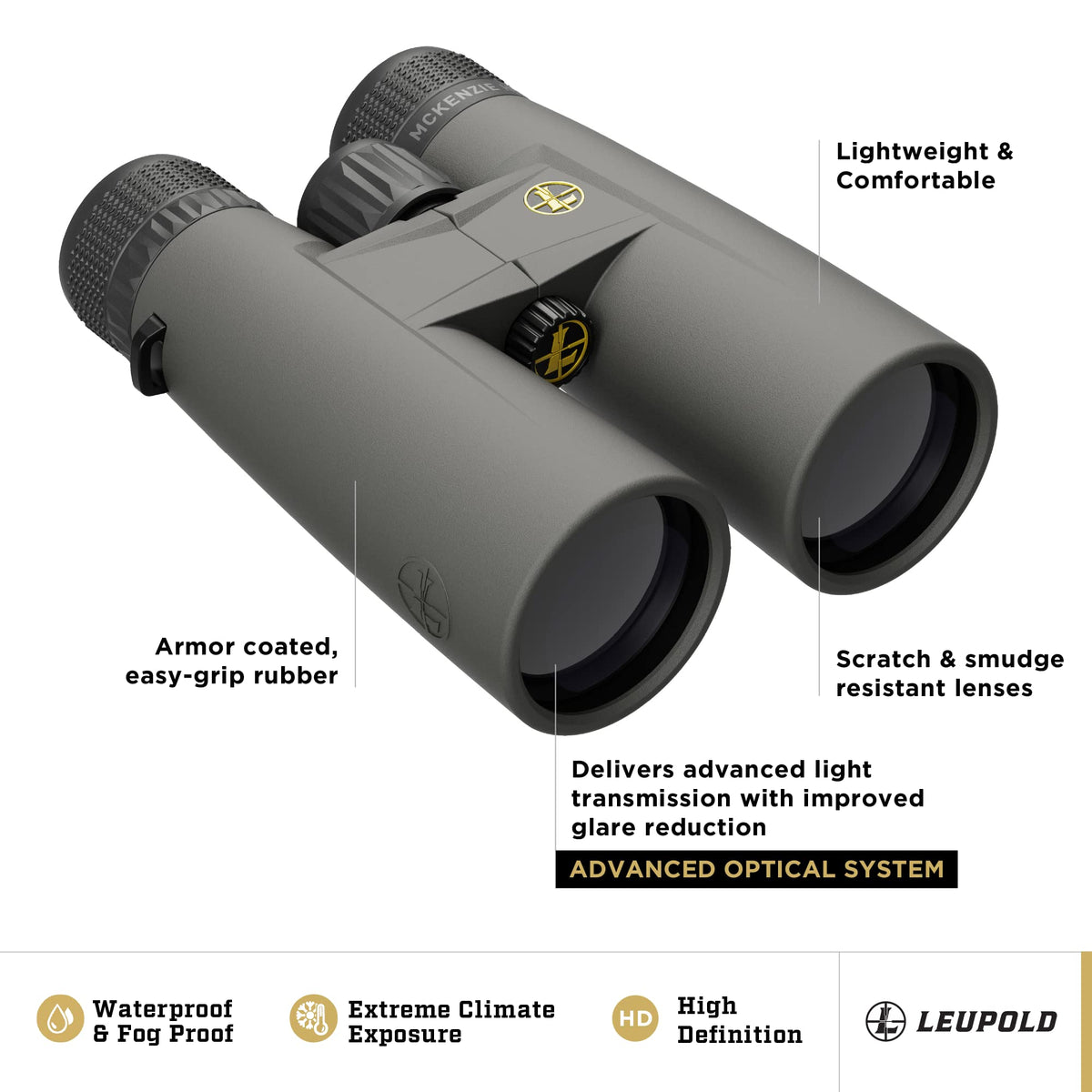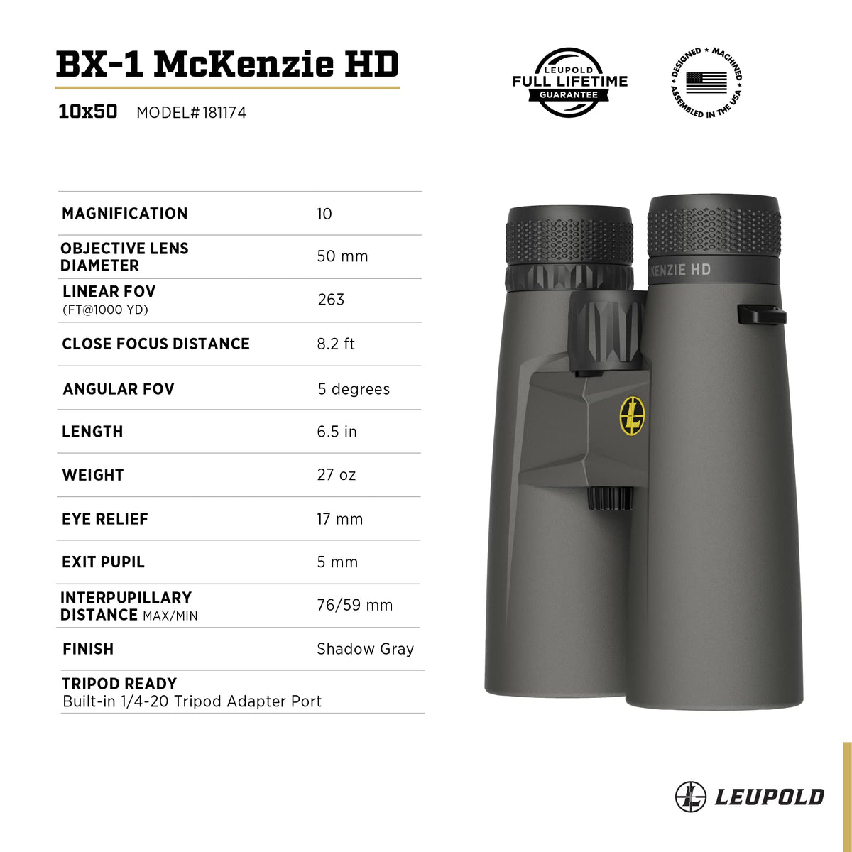 A Quality 10X Bino Is Hard To Beat Because It Delivers Significant Magnification In A Lightweight Package. With The Perfect Field Of View For Dense Brush, Yet Enough Power For Long-Range Detection And High-Definition Performance, The Bx�-1 Mckenzie� Hd 10X50Mm Binocular Won'T Let You Down. Designed Around Leupold�S Advanced Optical System, It Offers Tried And True Light Transmission For Extended Glassing Sessions, Best In Class Glare Reduction In Harsh Light, And The Resolution And Clarity That Recreational Sportsmen And Sportswomen Demand. It Comes With Pro Gear� Accessories, Too: Including A Go Afield� Shoulder Strap, Binocular Case, Lens Covers, And Lens Cloth. And Like All Leupold� Binoculars, It'S Fogproof, Waterproof, And Guaranteed To Perform For Life.