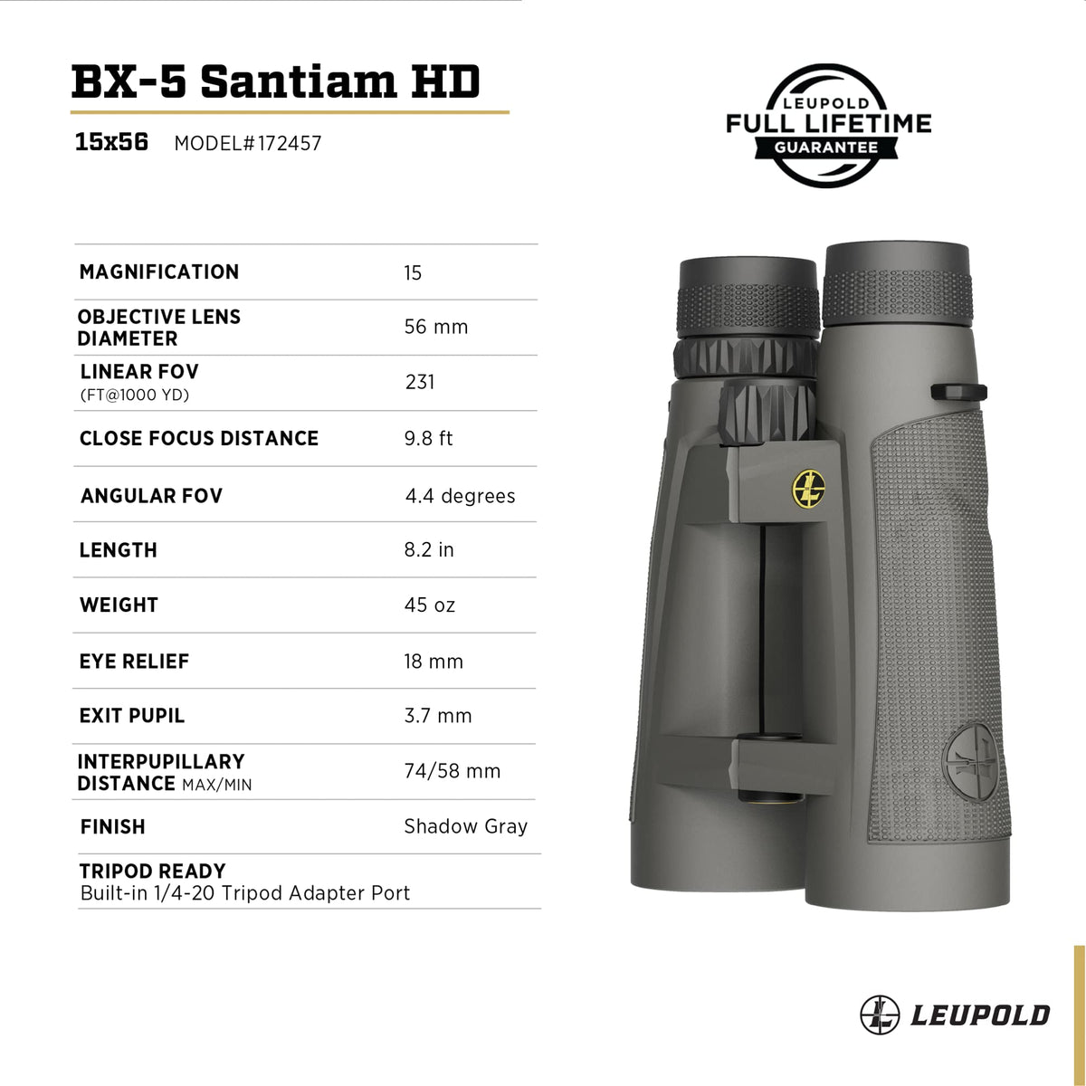 If You Constantly Debate Whether You Should Take Your Binocular Or Spotting Scope On Your Upcoming Hunt Or Range Session, Then You Might Want To Consider A Bino You Can Spot With. The Bx-5 Santiam Hd 15X56Mm Binocular Boasts A Clear And Powerful 15X Magnification To Make Identifying Your Target A Lot Easier. Designed For Epic Adventures In Harsh Environments, The Bx-5 Santiam Hd Binocular Dominates Other Optics In Its Class. It'S The Perfect Glass For Anyone Who Demands Professional-Grade Performance. The Generous Eye Box Is Designed For Long Glassing Sessions With No Eye-Strain, While The Open-Bridge Design Is Comfortable And Easy To Carry. Built Around Leupold'S Professional-Grade Optical System, It Offers Unmatched Light Transmission Thats Designed To Outperform In The Most Challenging Lighting Conditions. The Industry Leading Glare Reduction Provides A Clear Image In Harsh, Direct Light, While The Resolution And Clarity Will Meet The Demands Of Any Professional Guide Or Hunter In The Field. It Comes With Pro Gear Accessories, Too: Including A Binocular Tray Tripod Adapter, Go Afield Shoulder Strap, Binocular Case, Lens Covers, And Lens Cloth. And Like All Leupold Binoculars, It'S Fogproof, Waterproof, And Guaranteed To Perform For Life.