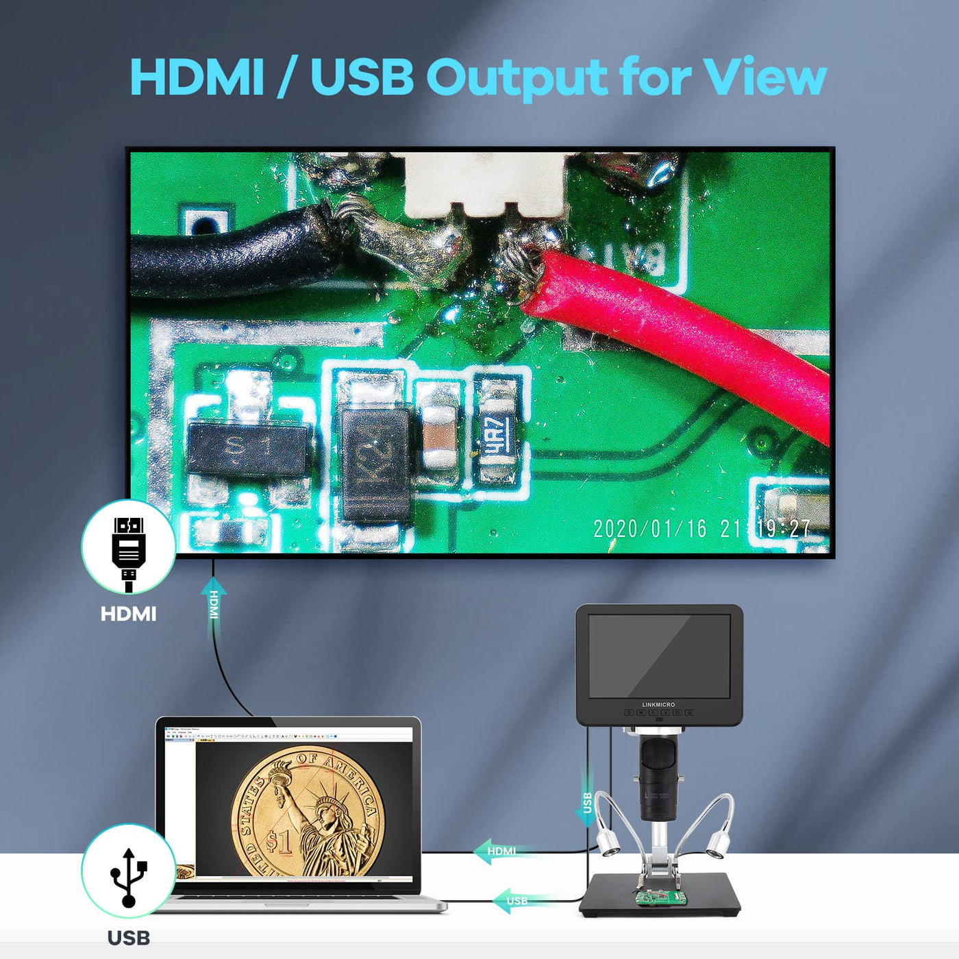 Linkmicro Lm246Ms 3 Lens 7 Inch Hdmi Digital Microscope 2000X For Soldering With 13'' Arm Boom Stand, Uhd 2160P, Error Coin Micr