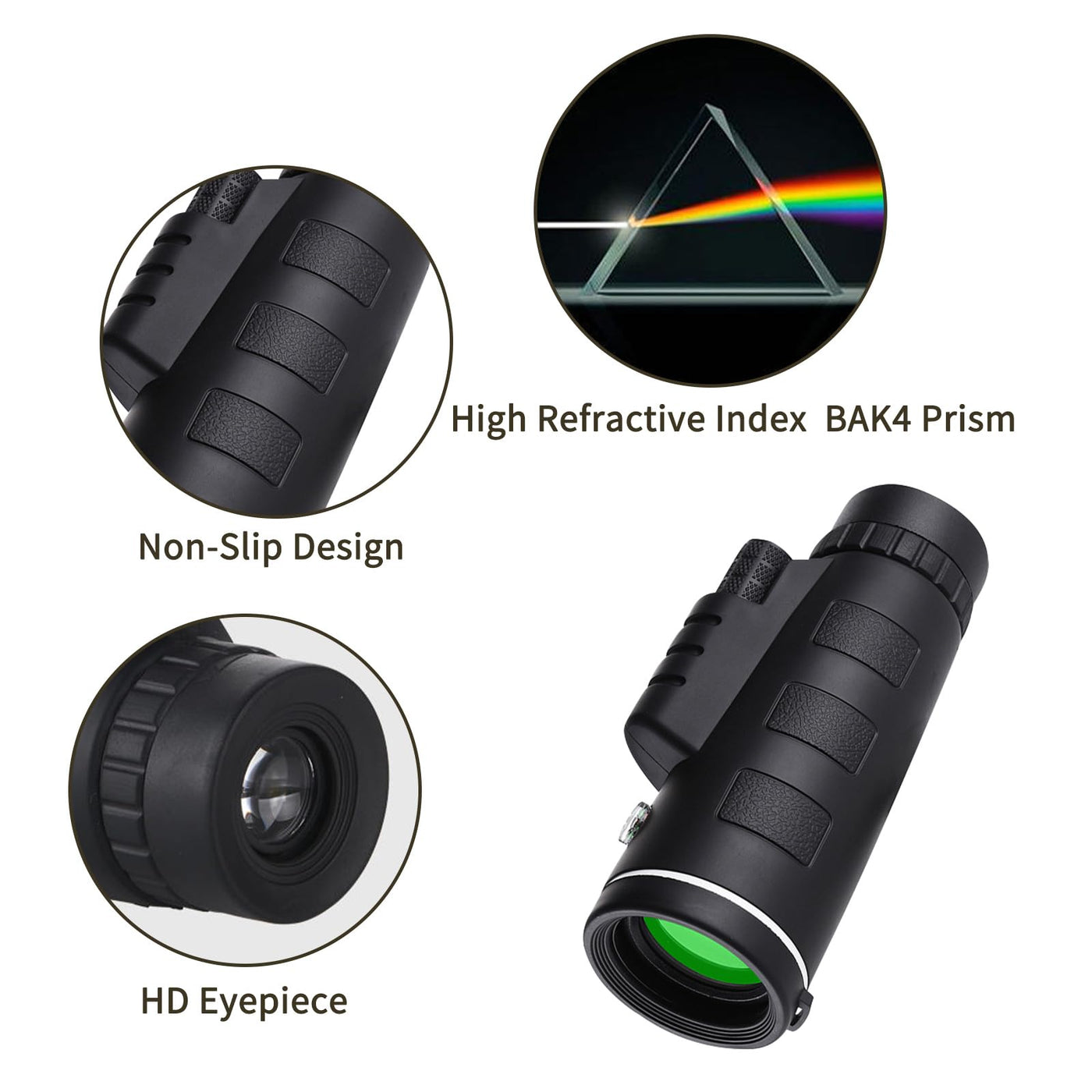 Q: What makes this monocular different from other telescopes?A: The Lizbin 40x60 Monocular Telescope features a compact design, making it lightweight and easy to carry. Its BAK-4 optics prism and FMC multilayer coating enhance light transmission and provide clear, bright images without color distortion.