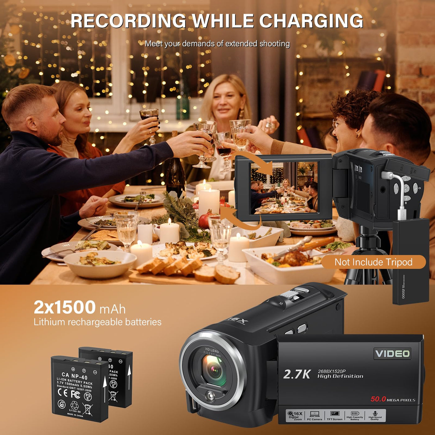 Warm Tips:1. Please Read The User Manual Carefully Before Use. Format The Sd Card On The Camcorder When You Use It. (32Gb Sd Card Included)2. Please Fully Charge The Camcorder Before Using It For The First Time.3. Please Read The User Manual Carefully Before Using The Camcorder. Camcorder Specifications:- Video Resolution: 2.7K/2688*1520, 1080P/1920*1080, 720P/1280*720- Video Format: Avi- Photo Resolution: 5M, 8M, 12M, 16M, 18M, 20M, 24M, 30M, 36M, 48M, 50M- Digital Zoom: 16X- Light Sensitivity: Auto, Iso100, Iso200, Iso400- Lens: F/3.2, F=7.6Mm- External Mic: Support- White Balance: Automatic / Sunny / Cloudy / Incandescent / Fluorescent- Exposure Compensation: -3.0Ev ~ +3.0Ev- Self-Timer: Off / 2S / 5S / 10S- Computer Interface: Camera: Usb2.0 (High Speed) / Disk: Usb2.0 (High Speed)- Lcd Screen: 2.8'' Lcd Display Screen- Power Supply: Li-Ion Battery Np-40- Dimensions: 5.7(L) 3.3(H) 4.1(W) In- Weight: Approx 0.97 Lb Package Content:- Camcorder X 1- Np-40 Lithium Battery X 2- 32Gb Sd Card X 1- Storage Cloth Bag X 1- User Manual X 1- Type-C Cable X 1