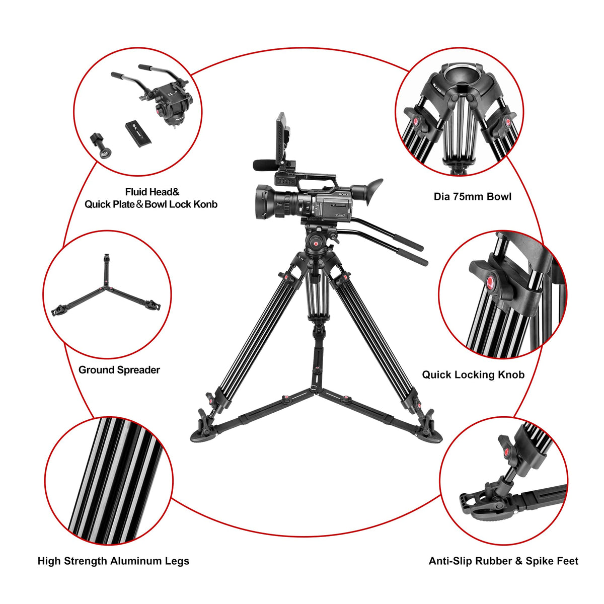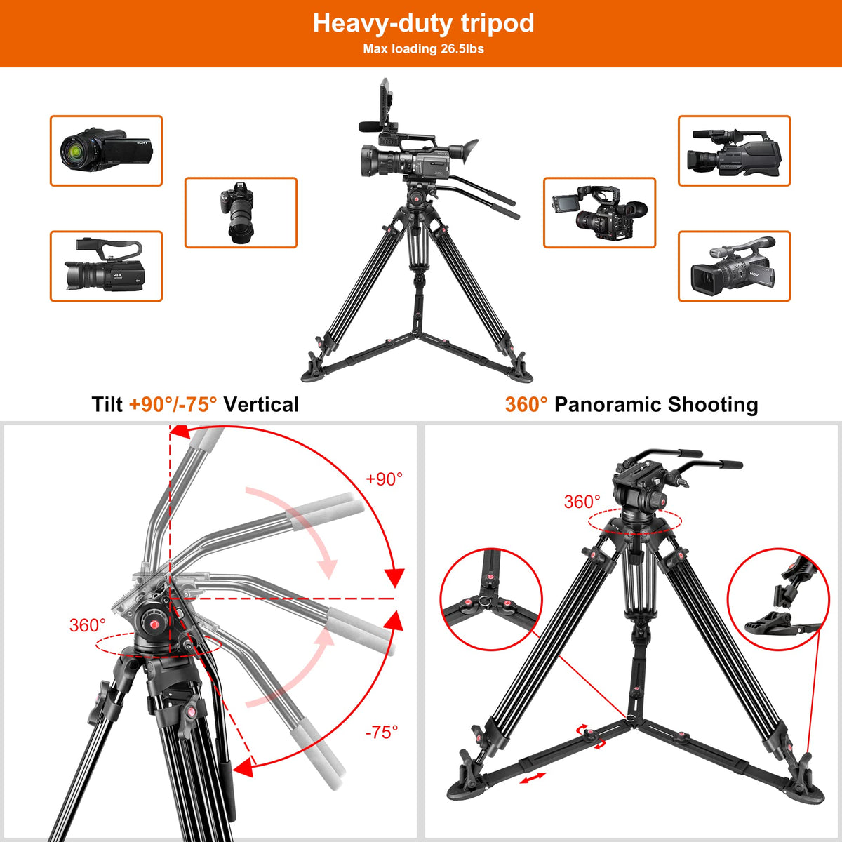 Magicline 68.7 Inch Heavy Duty Aluminum Video Camera Tripod With 2 Pan Bar Handles,Fluid Head,Adjustable Ground Spreader,Dual-Spiked&Rubber Feet,Quick Release Plate System, Max Load 26.5 Lb For Canon Nikon Sony Dslr Camcorder Cameras
