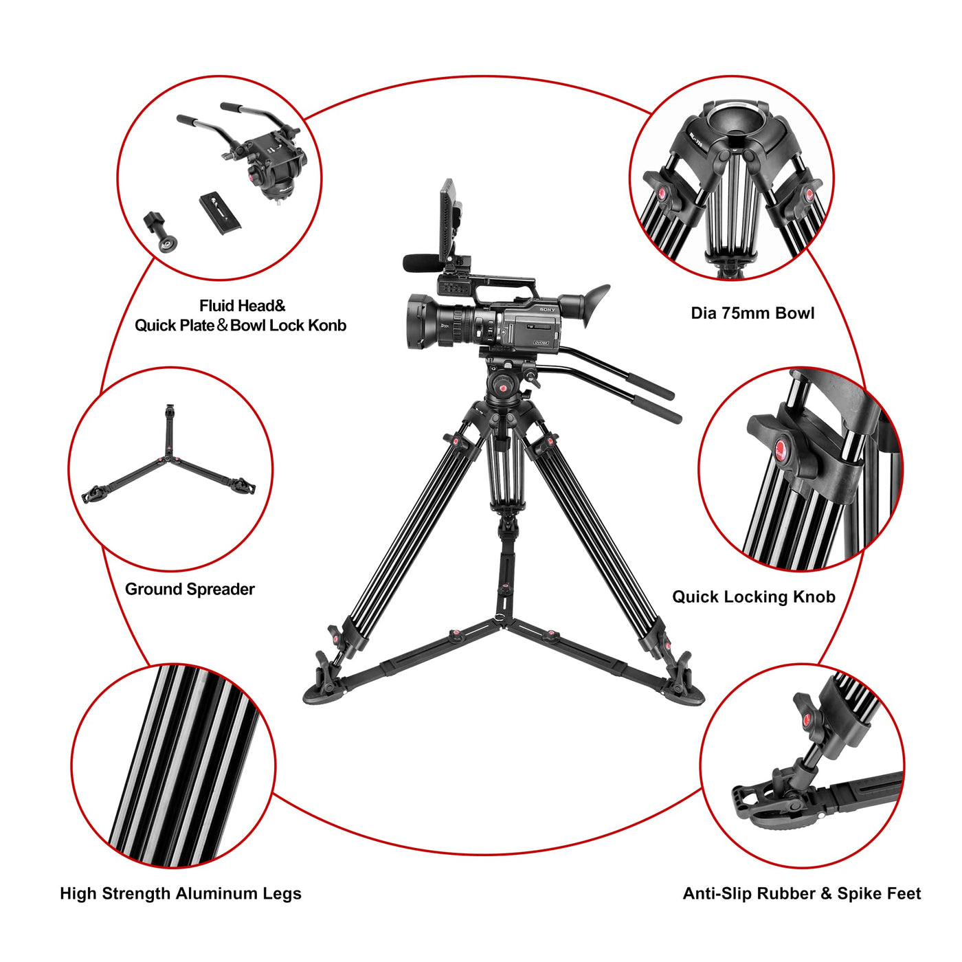 Magicline 68.7 Inch Heavy Duty Aluminum Video Camera Tripod With Fluid Head, 2 Pan Bar Handles, Adjustable Ground Spreader,Qr Pl