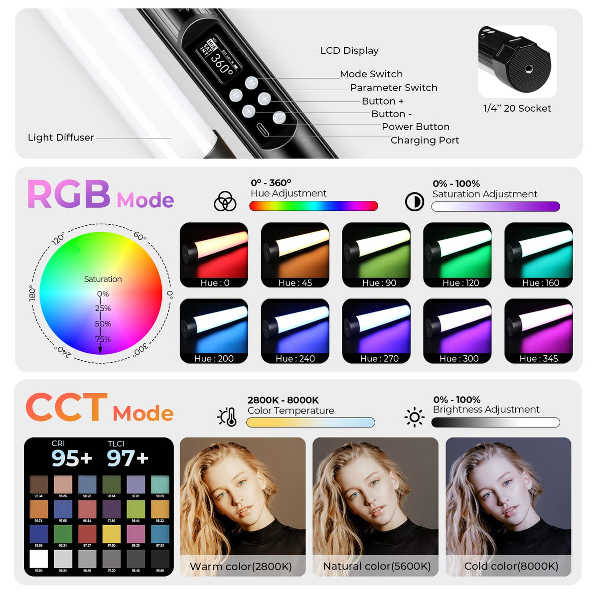 Mettlelite Tlx1 Rgb Tube Light Led Full Color Portable Video Light With App Control 2800K 8000K Cri96 Tlci97 360 Rgb Cct Hsi Mod