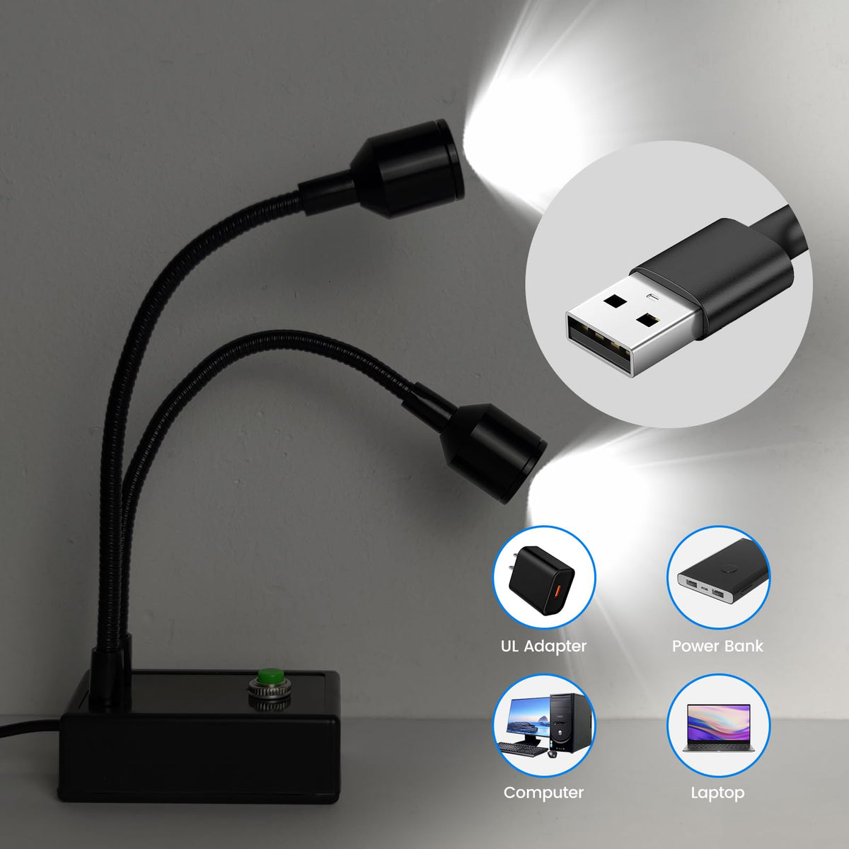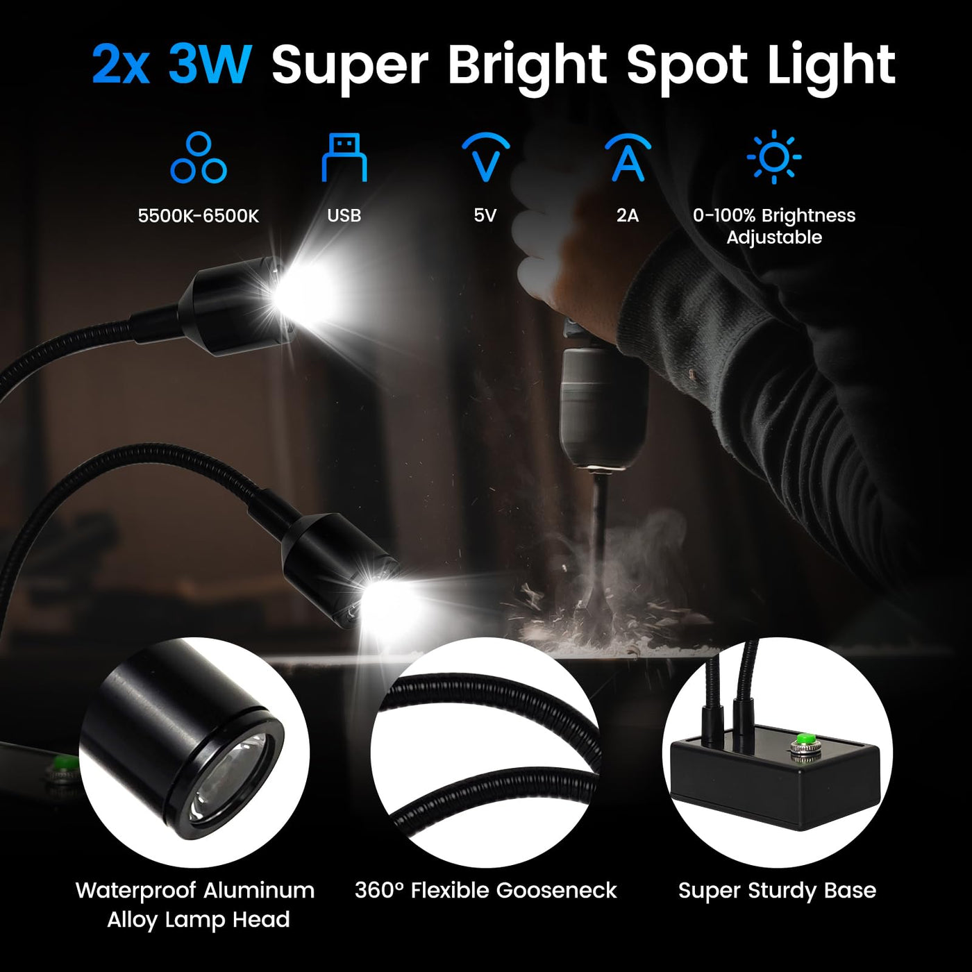 Input Voltage: Usb 5V 2A Led Light: 2X 3W Spot Light Brightness Adjustment Range: 0-100% Adjustable Control Method: Individual Domming Color Temperature:5500K-6500K Product Life:?100000Hrs