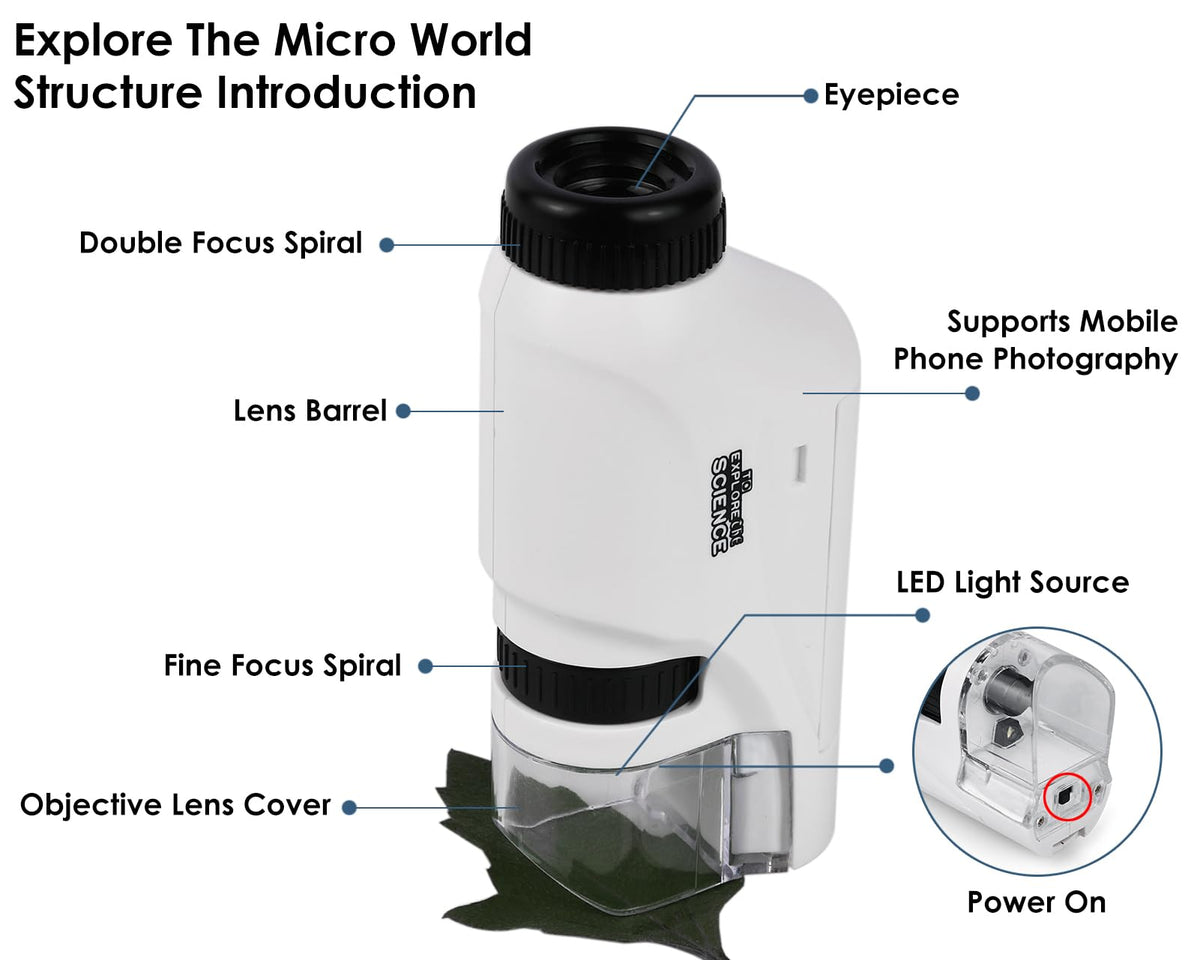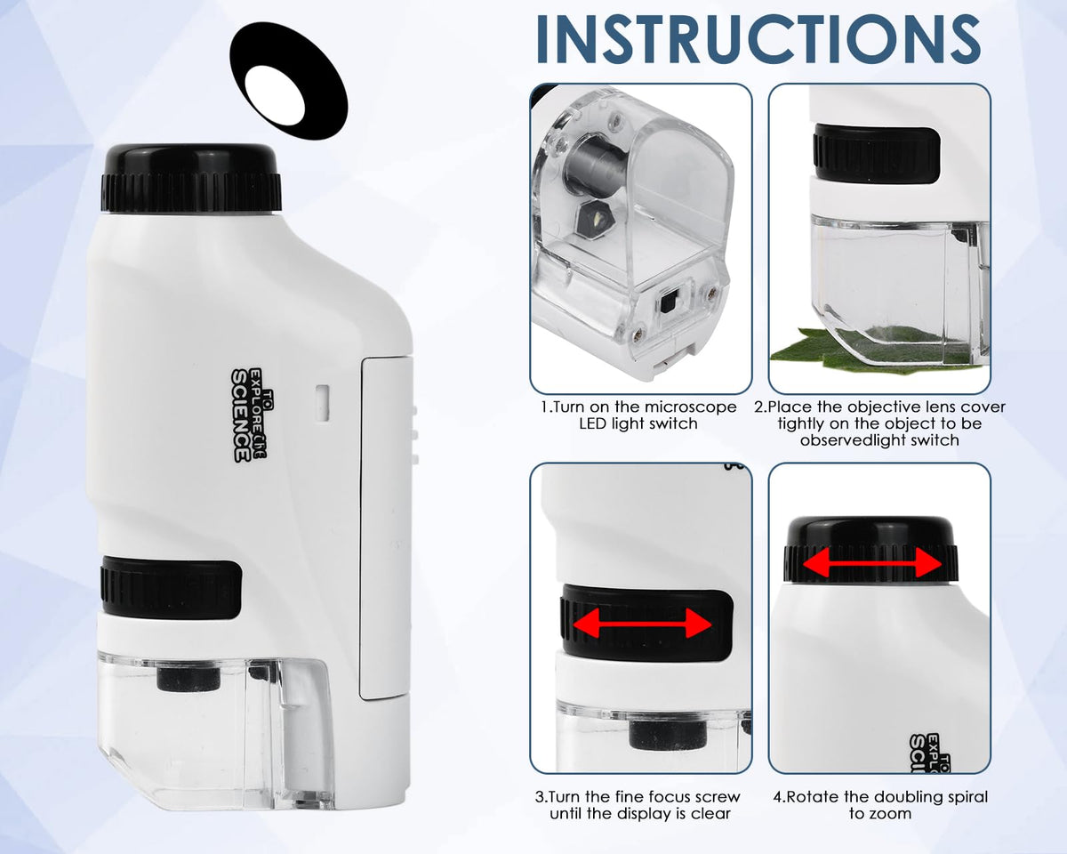 Q: What materials is the microscope made from?A: The pocket microscope is constructed from durable ABS acrylic material, ensuring it can withstand frequent use by children while remaining lightweight and portable.