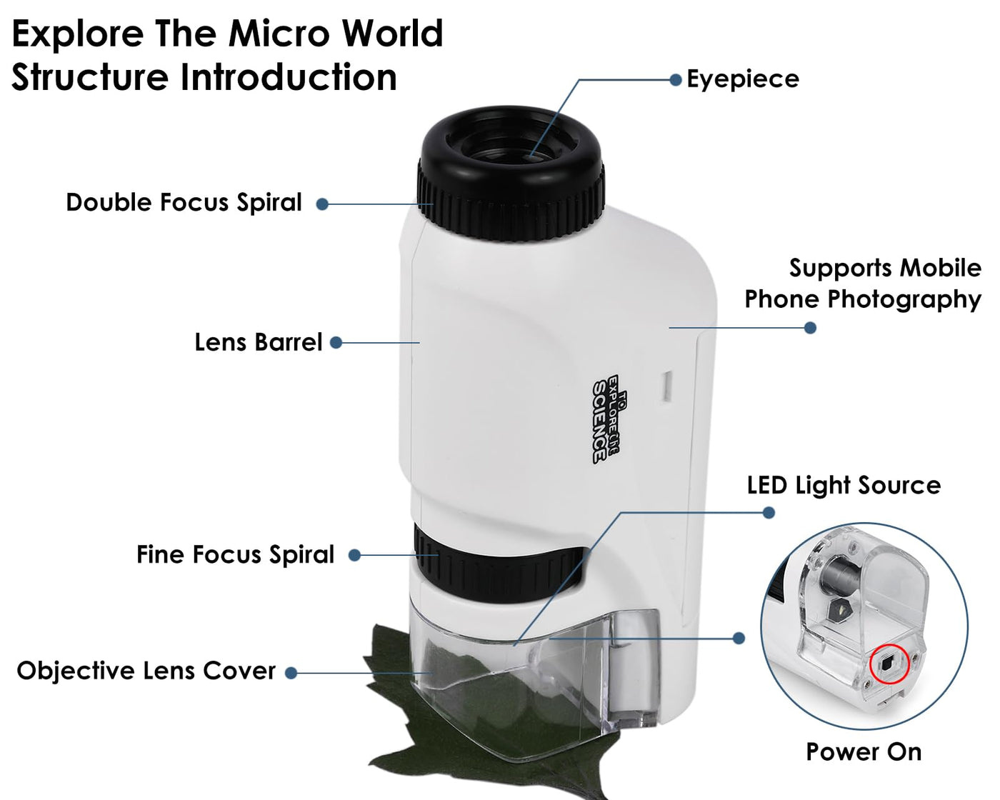 Q: What type of batteries does the microscope require?A: The Mini Microscope is powered by 2 AAA batteries, which are not included with the product for transport safety.