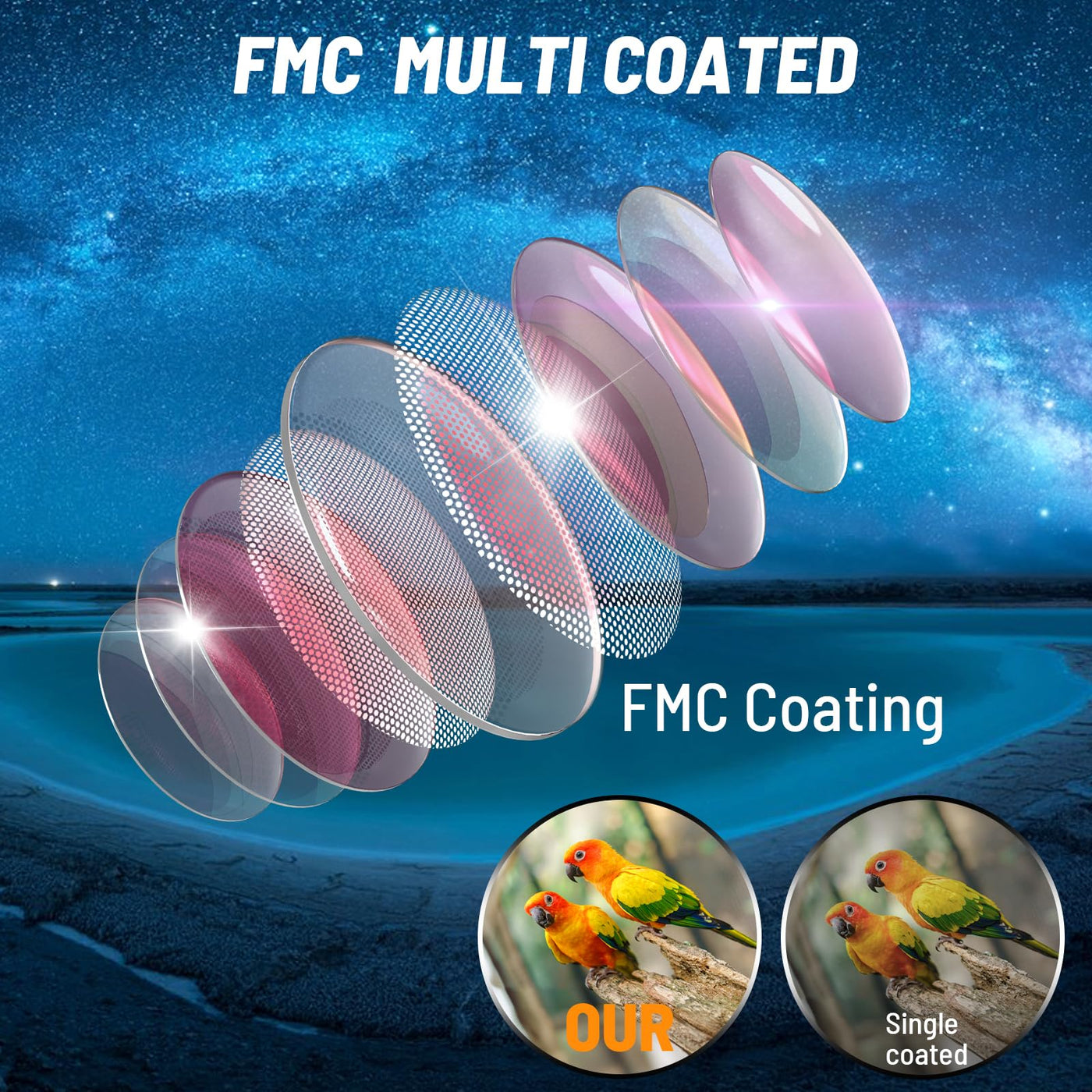 Q: What is the benefit of the BAK-4 prism and FMC coating in this monocular?A: The advanced BAK-4 prism combined with fully multi-coated (FMC) lenses minimizes light refraction loss, ensuring optimal light transmission. This results in clearer, brighter, and more colorful images, making the monocular effective for both daytime and low-light conditions.