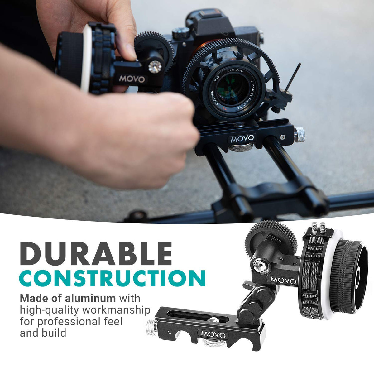 Q: What material is the Movo F2X Follow Focus made from, and how does it affect durability?A: The Movo F2X Follow Focus is constructed from high-quality aluminum, which provides durability and a professional feel. This material choice ensures that the follow focus can withstand the rigors of filmmaking while maintaining precision.