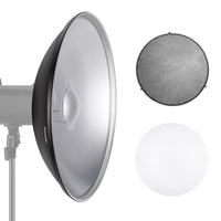 Compatible With Any Monolight And Led Continuous Video Light With The Standard Bowens Mount. The Beauty Dish Reflector First Bounces Lighting Backward With The Deflector Plate, Then Fills Lighting Inside The Dish And Casts A Wide And Diffused Beam. The Silver Interior Maximizes Light Intensity And Retains The Neutral Color Rendition. The Honeycomb Grid Narrows The Light Spill And Creates Dramatic Contrast And Texture. And The Diffusion Sock Broadens The Light Source And Eliminates Shadows. Aluminum Alloy Ensures High Durability And A Small Weight-Optimal For Outdoor And Indoor Photography And Filmmaking. Specifications Model: Nk-Narc22 Material: Aluminum Alloy Diameter: 21.6''/55Cm Depth: 6.7''/17Cm Package Contents 1 X Beauty Dish Reflector (21.6''/55Cm) 1 X Honeycomb Grid 1 X Diffusion Sock