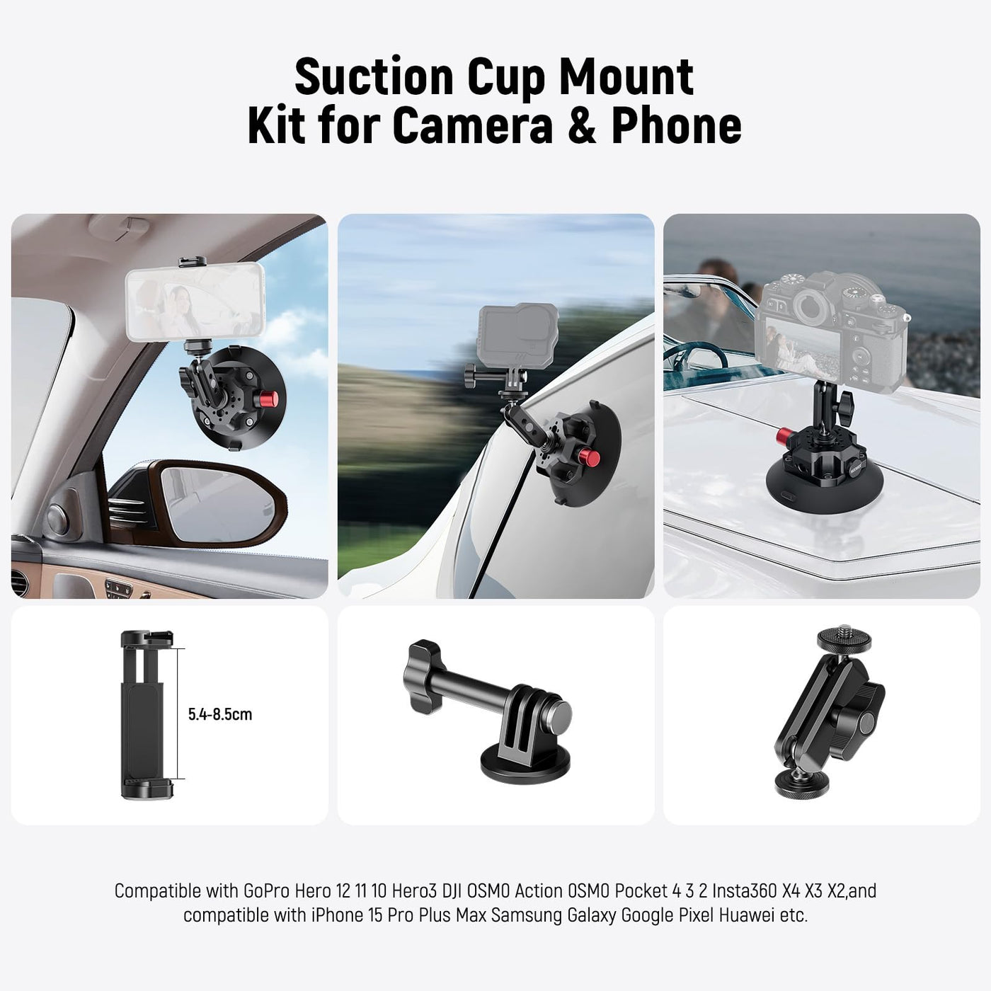 The Suction Cup Camera Mount Kit Offers A Secure And Versatile Mounting Solution For Your Action Cameras And Smartphones. It Features A 4.5Inch Pump Activated Vacuum Suction Cup, A 360 Dual Ball Head Magic Arm, And An Action Camera Adapter. With Excellent Load Capacity, It Can Support Up To 6.6Lb (3Kg) At High Speeds, 132Lb (60Kg) Horizontally, And 88Lb (40Kg) Vertically On Stationary Surfaces. The Suction Cup Mount Is Quick To Release, Easy To Set Up, And Compatible With Hero 12 11 10 Hero3 Compatible With Dji Osmo Action Osmo Pocket 4 3 2 Compatible With Insta360 X4 X3 X2, And Compatible With Iphone 15 Pro Plus Max Samsung Galaxy Google Pixel Huawei, Etc. Crafted With Aluminum Alloy, It Is Suitable For Outdoor Use. Specifications Model: Ca105 Item Type: Vacuum Pump Suction Cup Compatibility: Phone/Camera/Action Camera Application: Photo & Video Main Features: Dual Ball Head & Quick Setup Mounting Points: 1/4'', 3/8'', Arri Main Material: Aluminum Alloy, Rubber Load Capacity: 6.6Lb/3Kg Dimensions: 5.3''X4.7''X5.5''/135X120X140Mm Weight: 16.9Oz/480G Package Contents 1 X 4.5''/114Mm Vacuum Pump Suction Cup 1 X Dual Ball Head Magic Arm 1 X Action Camera Adapter 1 X Phone Holder
