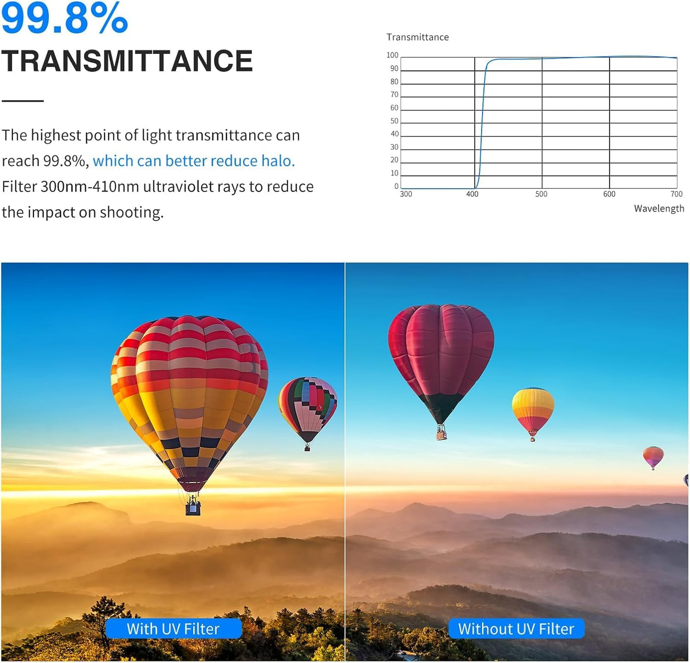?Protective Uv Filter? This Uv Filter Reduces Haze And Minimizes Ultraviolet (Uv) Rays While Improving Contrast. Perfect For Capturing High Altitude And Snow Photos Without The Bluish Cast. Keep This Filter On Your Lens To Protect Against Dust, Scratches, And Bumps | ?High-Quality Optical Glass? The Quality Optical Glass Protects Your Lens From Dirt, Scratches, Fingerprints, And Unexpected Damage | ?Nano-Coatings? Featuring 30 Layers Of Optical Coatings And A Light Transmittance Of Up To 99.8% (And A Minimum Light Reflectance Of Less Than 0.1%), The Multicoated Uv Filter Blocks Out Ultraviolet Rays Ranging From 300Nm To 410Nm To Reduce Flare And Ghosting While Ensuring Accurate Color Rendition. The Coatings Are Also Anti-Static, Oil-Resistant, Water-Repellent, And Scratch-Resistant | ?Strong Lens Frame? Made Of Aluminum-Magnesium Alloy, The Filter Frame Is Strong And Durable. With Precision Manufacturing And A Matte Black Anodized Finish, The Screw-On Filter Is Easy To Use And Has Less Reflections From The Metal Filter Frame. The 0.22
