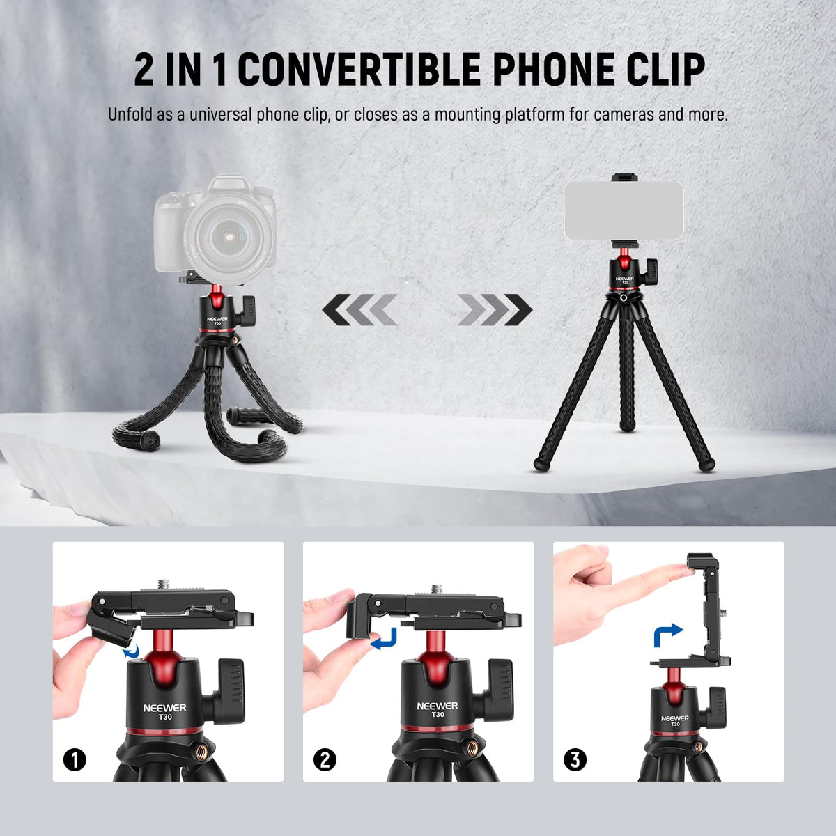 Introducing Our Versatile Mini Tripod With Bendable Legs, Supporting Smartphones, Dslr, Or Action Cameras Up To 4Lb/2Kg. It Wraps Around Objects For Unique Perspectives, Transforms Into A Stand Or Selfie Stick For Video Recording, Filmmaking, Vlogging, And Live Streaming. Featuring A 360 Ball Head And 90 Vertical Shooting, It Swiftly Switches Between Portrait And Landscape Modes. The Detachable Ball Head Connects To Other Tripods Via A Bottom 1/4'' Screw. The 2 In 1 Design Integrates The Tripod Head With The Phone Holder For Seamless Switches Between Cameras And Phones. Compatible With Canon Sony Nikon Dlsr Cameras, Compatible With Gopro Hero 12 11 10 9 Black Insta360 Dji Action Cameras (Adapter Included), And Compatible With Iphone 15 Pro Max 14 13 12 Pro Max Mini Samsung Galaxy S23 S22 Ultra Note Google Pixel 8 7 Pro Huawei P60 Mate60 Pro, Etc. Enhance Your Photography With The Included Wireless Shutter Remote, Capturing Images Wirelessly From Up To 33Ft/10M Away, Minimizing Shake For Clear And Professional Shots. Specifications Model: T30 Item Type: Mini Tripod Compatibility: Dslr Action Camera Phone Application: Selfie Vlog Live Stream Video Main Features: 2 In 1 Phone Holder Mounting Points: 1/4'', Cold Shoe Main Material: Aluminum Alloy, Rubber Load Capacity: 4.4Lb/2Kg Dimensions: 12.2''/310Mm Weight: 11.3Oz/310G Package Contents 1 X Flexible Tripod For Camera With Ball Head 1 X 2 In 1 Phone Holder 1 X Shutter Remote 1 X Action Camera Adapter