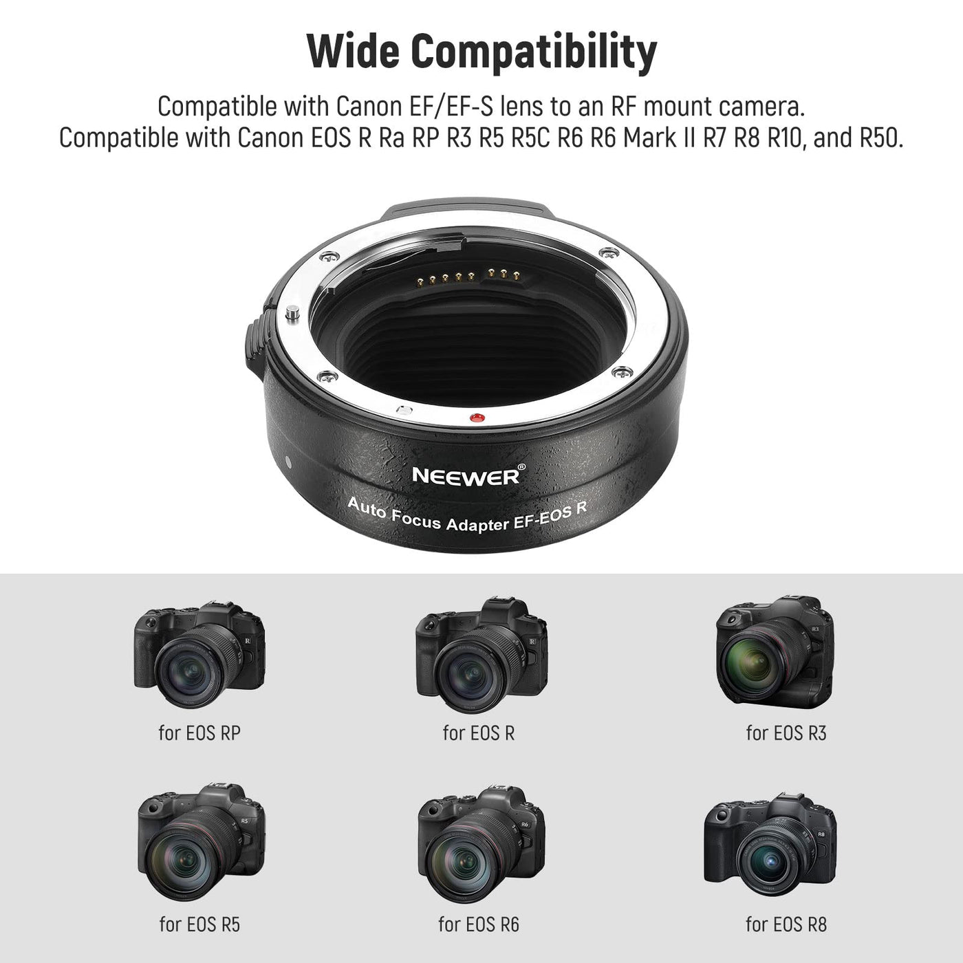 Product Descriptions Note: 1. The Adapter Does Not Support Af-C In Video Mode. 2. A Lens Support Is Necessary If The Lens Is Over 4.4Lb (2Kg). Compatible With Canon Ef Lenses And Eos Rf Mount Cameras. This Mount Adapter Connects Any Ef/Ef-S Lens To Rf Mount Cameras, Including Eos R Ra Rp R3 R5 R5C R6 R6 Mark Ii R7 R8 R10, And R50 For Seamless Compatibility. Electrical Contacts On The Mount Adapter Maintain Autofocus, Auto Aperture Control, Image Stabilization, And Other Functions In Your Lens While Restoring Complete Exif Data. The Weather Resistant Design Can Withstand Rain, Dust, And Other Harsh Conditions. Metal Mounts On The Front And The Back Ensure Outstanding Performance For Years. Specifications Model: Nw-Ef-Eosr Compatible Lenses: Ef/Ef-S Series Lenses Compatible Cameras: Eos Rf Mount Cameras Front Installation: Ef/Ef-S Lenses Back Installation: Eos Rf Mount Cameras Camera Mount Outer Diameter: 2''/50Mm Lens Mount Outer Diameter: 2.6''/65Mm Length: 1.1''/29Mm Weight: 6.2Oz/175G Package Contents 1 X Ef-Eos R Lens Mount Adapter 1 X Front Cap 1 X Rear Cap 1 X User Manual