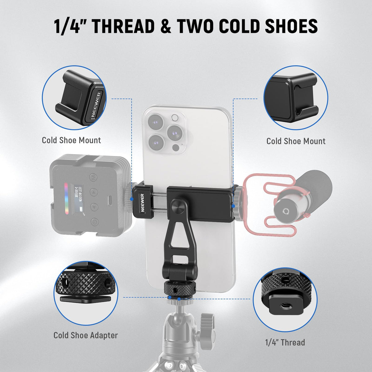 Neewer Metal Phone Tripod Mount With Cold Shoes, 1/4'' Thread, 180 Tilt, 360 Rotation, Adjustable Phone Clamp Metal Phone Holder