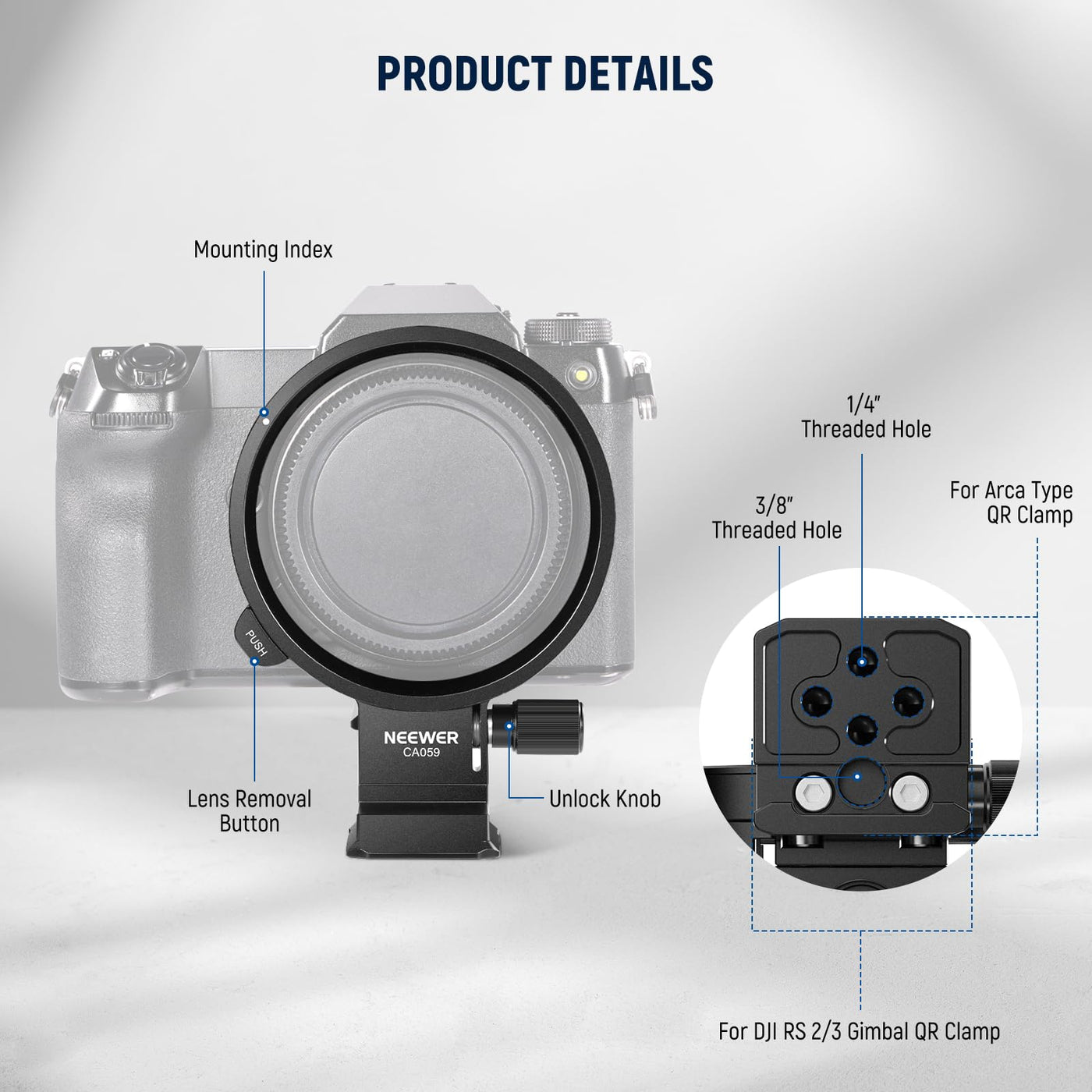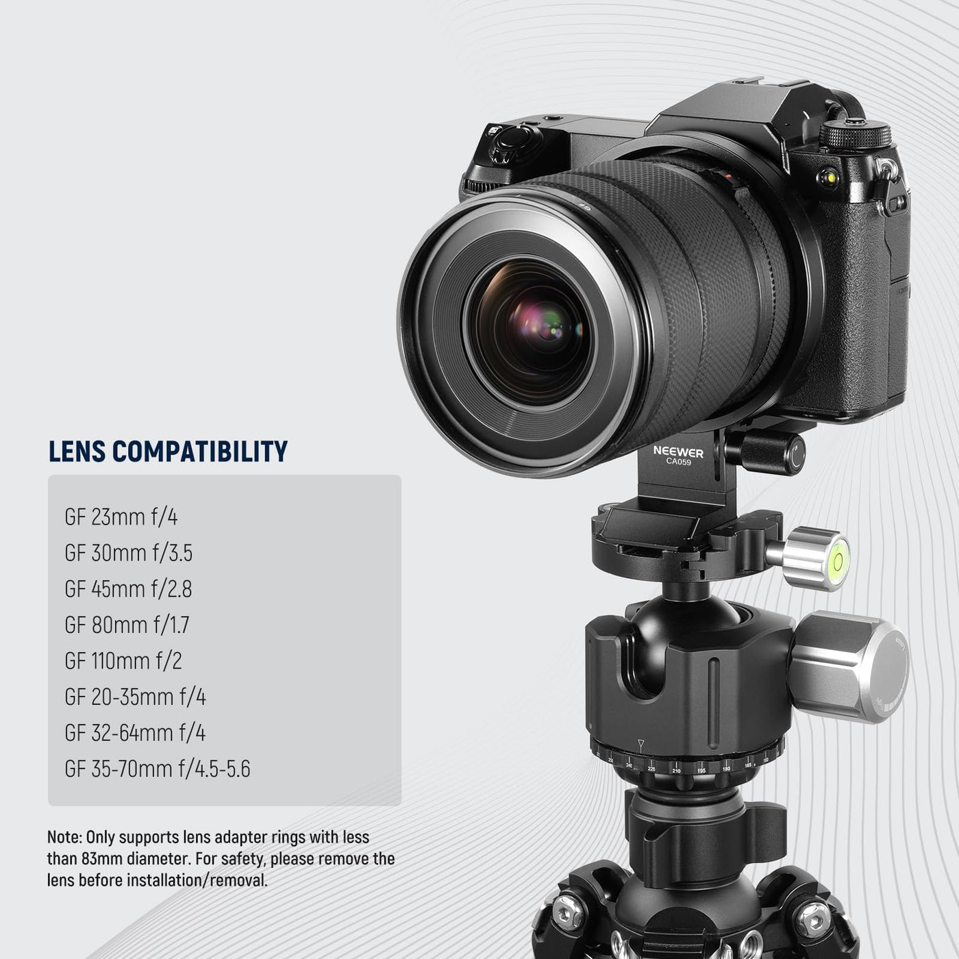 Note: 1.Please Remove The Lens Before Installation/Removal. 2.Only Support Lens Adapter Rings With Less Than 83Mm Diameter. The Neewer Ca059 Camera Rotating Bracket Ensures Smooth Transitions Between Horizontal And Vertical Shots, Maintaining Stability For Heavy Lenses. Compatible With Fujifilm Gfx 100S / Gfx 50S Ii/ Gfx100 Ii Medium Format Cameras, Compatible With Gf 20-35Mm F/4 110Mm F/2 23Mm F/4 35-70Mm F/4.5-5.6 45Mm F/2.8 30Mm F/3.5 80Mm F/1.7 32-64Mm F/4 Camera Lenses. Easily Switch Between Landscape And Portrait Orientations With A 90 Degree Rotation Of The Camera Lens Collar. Secure Your Camera With The Anti Twist 1/4'' Screw And Cross Patterned Rubber Pads. The Vertical Camera Mount Features Two Collar Tabs For Added Lens Security And Allows Slight Vertical Adjustment, Ensuring Proper Centering For Lenses Of Various Sizes. The Quick Release Base Is Compatible With Arca Swiss Dji Rs3 Pro Rs3 Mini Rs3 Rs2 Pro Rs2 Vertical Camera Mount, Facilitating Easy Installation On Tripods, Gimbals, And More. The Ultra Slim Frame, Crafted From Cnc Anodized Aluminum Alloy, Ensures Durability And Unrestricted Access To The Camera'S Functions, Even When Mounted On A Tripod. Specifications Model: Ca059 Item Type: Camera Lens Collar Compatibility: Fujifilm Gfx100 Ii 100S 50S Ii Application: Photo & Video Main Features: Horizontal & Vertical Shots Mounting Points: 1/4'', 3/8'' Main Material: Aluminum Alloy, Rubber Dimensions: 5.1''X3.8''X3.8''/13X9.7X9.7Cm Weight: 5.3Oz/150G Package Contents 1 X Camera Lens Collar 1 X Camera Mounting Plate 2 X L Shaped Hex Key 1 X User Manual