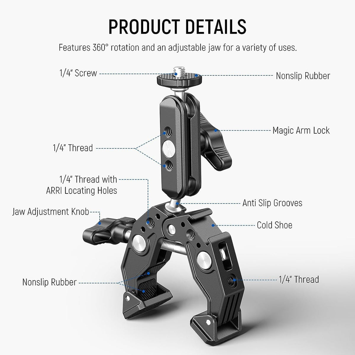 With A 0.6''-2.4'' (14-60Mm) Jaw Opening, This Pole Clamp Tube Holder With V Shaped Grooves And Pivoting Tips Can Grip Objects Like Desktops, Tripods, Shoulder Rigs, And Bicycle Handlebars. It Is Also Compatible With Dji Ronin-M Ronin Mx & Freefly Movi 25Mm And 30Mm Rods.1/4'' Threads, 3/8'' Threads, And Arri Locating Points Can Connect Numerous Accessories. And The Cold Shoe Bracket Helps You Secure A Led Light Or Microphone. Nonslip Rubber Pads Can Increase Stability And Protect Your Equipment Against Scratches.Two 360 Ball Heads Make The Magic Arm Freely Change Positions And Allow You To Shoot In Any Possible Direction. The Screw Knob Lets You Fasten Ball Heads In Seconds.An Included Phone Holder Supports Your Smartphone, And An Action Camera Adapter Mounts A Wide Range Of Action Cameras.Compatible With Iphone 14 13 12 11 Pro Max Plus Mini X Xs Xr Samsung Galaxy S20+ S20 Huawei P40 Pro Gopro Hero 11 10 9 8 7 Black Dji Action 3, Etc. The 1/4'' Mounting Screw Is Compatible With Monitors, Led Lights, Microphones And More.Specificationsmodel: St83Material: Aluminum Alloy, Stainless Steel, Rubberjaw Opening Range: 0.6''-2.4''/14-60Mmmax Load Capacity: 7.7Lb/3.5Kgdimensions: 6'' X 3.4'' X 1.6''/152 X 86 X 41Mmweight: 7.23Oz/205Gpackage Contents:1 X Super Clamp With Magic Arm1 X Action Camera Mount Adapter1 X Phone Holder1 X Detachable Cold Shoe Mount Adapter1 X User Manual