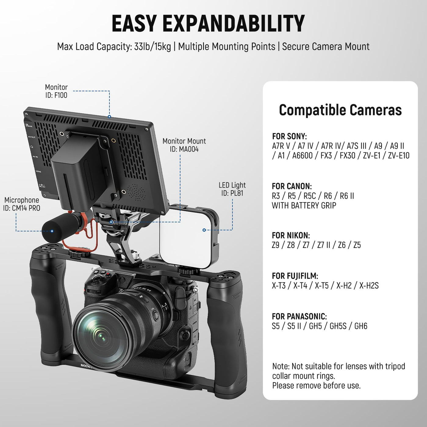 Neewer Ca016 Universal Camera Cage Is Compatible With Various Dslr Cameras, Mirrorless Cameras, And Vlog Cameras Of Up To 33Lb (15Kg). Note: This Camera Cage Is Not Suitable For A Lens With A Tripod Collar Mount Ring, Please Remove It Before Use. A 1/4'' Screw And A 1/4'' Countersink Slot Enable Quick And Convenient Camera Installation. A Flat Screwdriver Magnetically Stored Under The Cage Allows Easy Tension Adjustment. The Soft Nonslip Silicone Pad Adds Stability And Protects Your Camera From Scratches. 1/4'' Threads, Cold Shoe Mounts, And 3/8'' Threads With Arri Locating Holes Accessorize Your Rig With Top Handles, Magic Arms, Microphones, Field Monitors, Ball Head Adapters, Led Video Lights, And Other Gadgets For Function Expansion. A Standard Arca Type Baseplate Can Mount On A Tripod Video Head Or Fluid Head For Handsfree Shooting. The Double Handgrips Allow Effortless And Steady Handheld Shooting. Only 23Oz (650G) In Weight, The Camera Is Lightweight And Easy To Operate. The Neewer Ca007 Top Handle With 3/8'' Screw And Arri Locating Pins Is Included For Stable Handheld Video Shooting. It Also Features Several Mounting Points For Connecting A Monitor Or Led Light For Enhanced Vlog Quality. Specifications Camera Cage Model: Ca016 Material: Aluminum Alloy, Silicone Load Capacity: 33Lb/15Kg Weight: 23Oz/650G Top Handle Model: Ca007 Material: Aluminum Alloy, Silicone Load Capacity: 22Lb/10Kg Weight: 5Oz/145G Package Contents 1 X Universal Camera Cage 1 X Top Handle With 3/8'' Arri Locating Pins