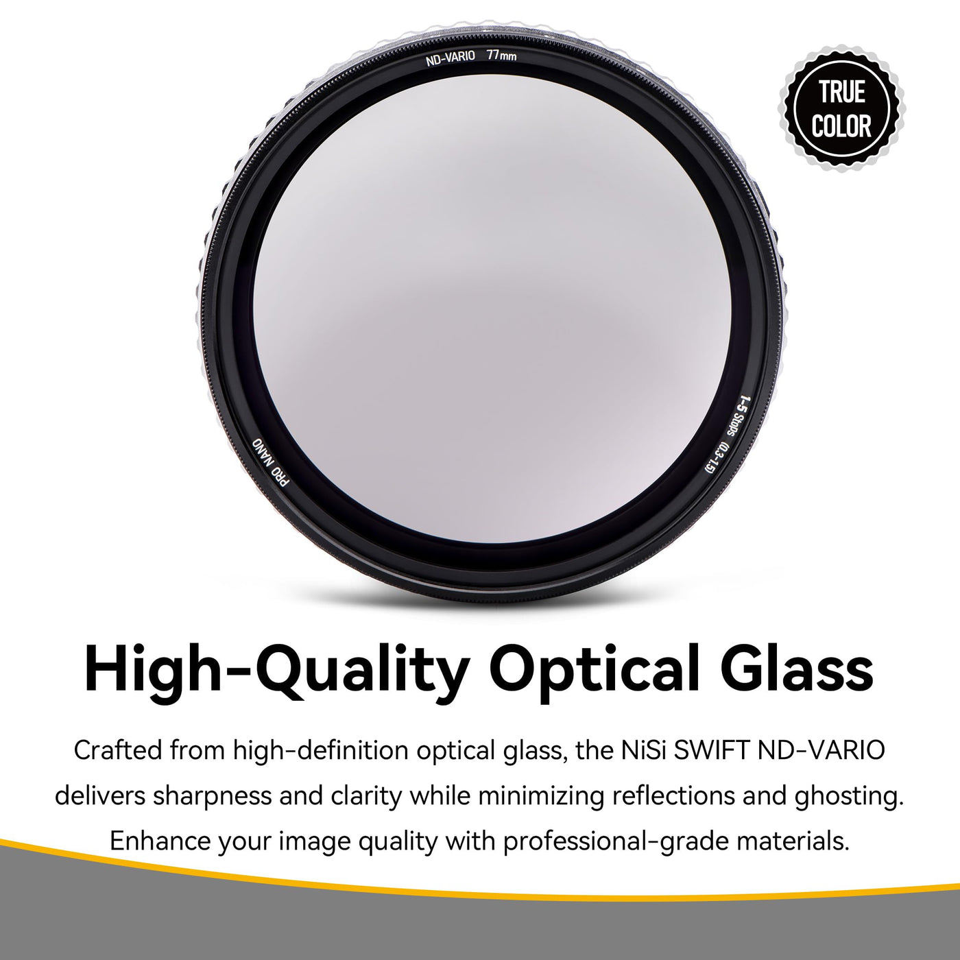 Introducing The Nisi True Color Swift Nd-Vario, An Innovative Filter Designed To Revolutionize Your Photography And Videography Experience. Offering A Versatile Exposure Reduction Of 1 To 5 Stops, This All-In-One Filter Is A Game-Changer In Various Shooting Scenarios.The 0.3 To 1.5 Density Range Darkens Your Entire Image, Enabling Wider Apertures And Slower Shutter Speeds For Creative Control. The Swift Variable Nd Includes A Removable Stainless Steel Control Handle For Seamless Density Adjustments, Preventing Accidental Finger Intrusion Into Shots. External Markings On The Slim Aluminum Frame Accurately Display Density Variations, While A Tactile ''Hard'' Stop At 1 And 5 Stops Ensures Precise Exposure And Aperture Settings.Our Filter Is Engineered For True-To-Life Color Reproduction, Eliminating Shifting And Unwanted Color Casts. White Balance And Color Temperature Remain Neutral, Minimizing Post-Processing Time And Delivering Exceptional Image Quality For Both Video And Still Photography. The Highest Quality Optical Glass, Coupled With Nisi Nano Coating, Ensures Sharpness, Clarity, And Resistance To Water, Smudges, And Reflections. It Also Tackles Vignetting Issues With Its One Filter Size Larger Front Element, Preventing Distortion On Ultra-Wide Or Telephoto Lenses Down To 35Mm. The Swift Nd-Vario Also Serves As A Base Holder For The Nisi Swift Circular Filter System, A Revolutionary Modular System For On-The-Go Creators. This System, With Friction-Mounting Instead Of Threads, Securely Attaches To The Swift Nd-Vario. Enhance Your Creativity Further With Specialized Thread-Less Filters (Sold Separately) That Press Securely Onto The Variable Nd, Expanding Its Capabilities By Combining Filter Effects. Say Goodbye To Unreliable Magnetic Systems-Nisi'S Swift Nd-Vario Is Your Reliable Partner In Capturing The Perfect Shot Every Time. Elevate Your Photography And Videography Game With The Nisi True Color Swift Nd-Vario.