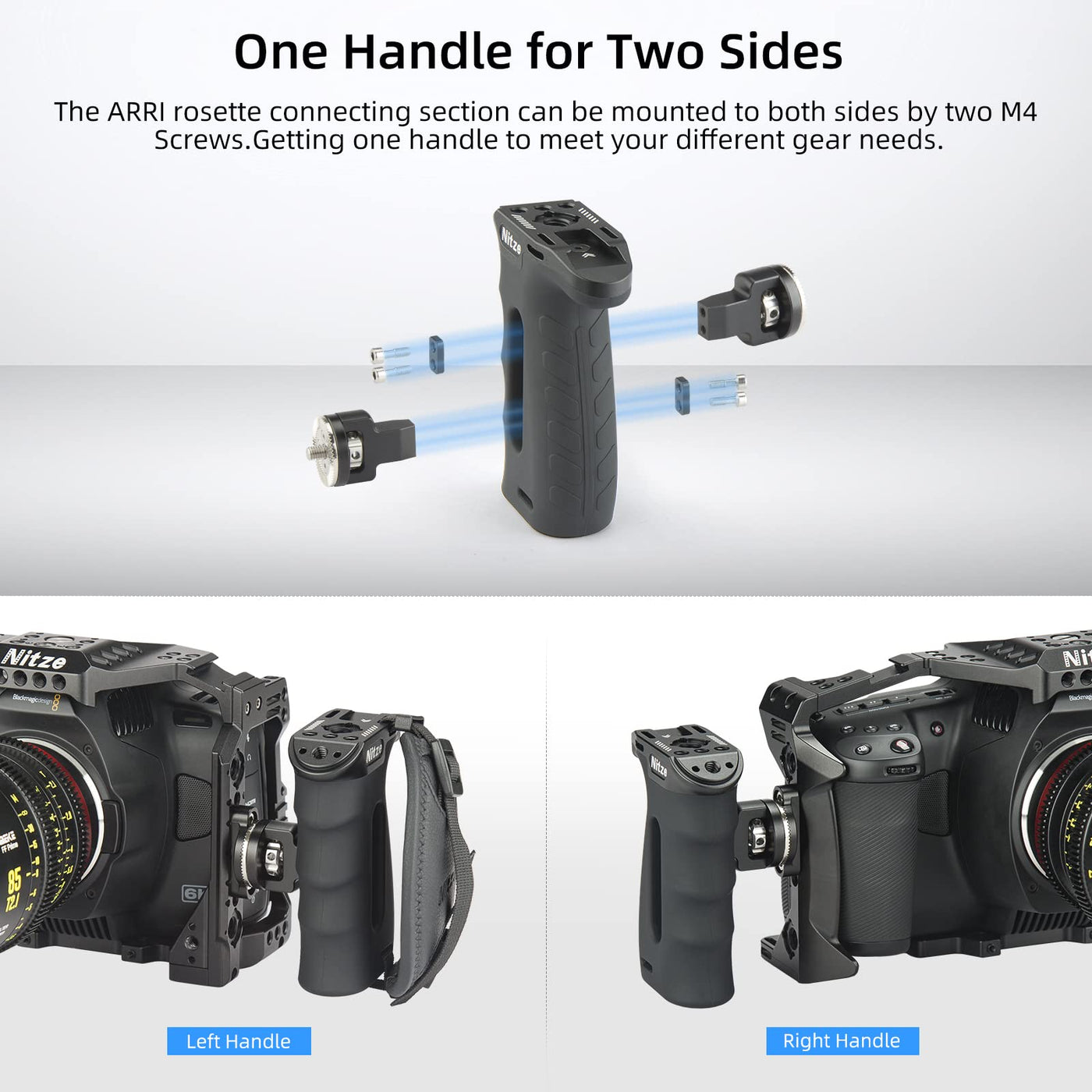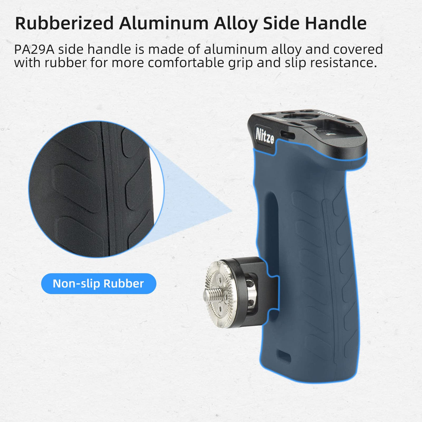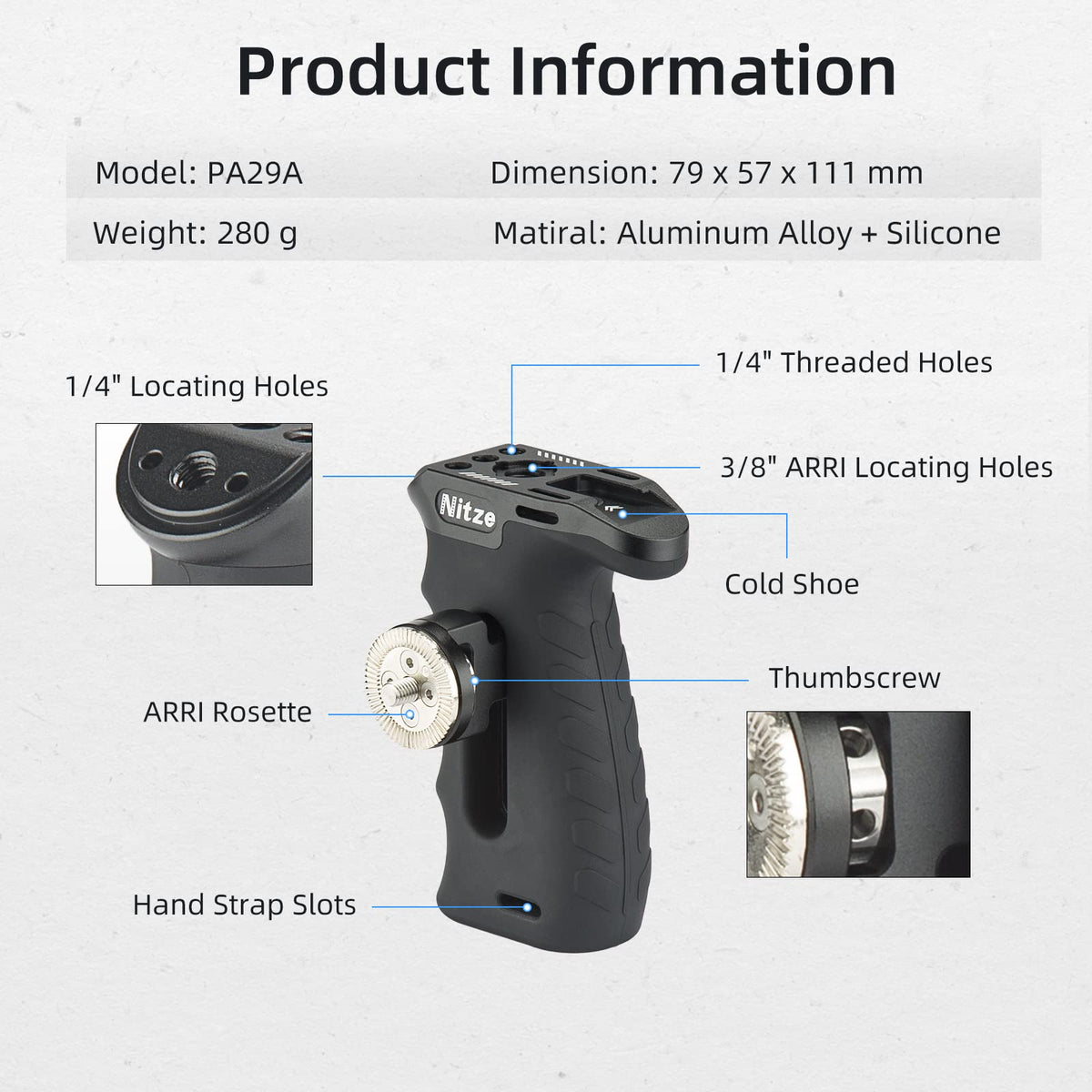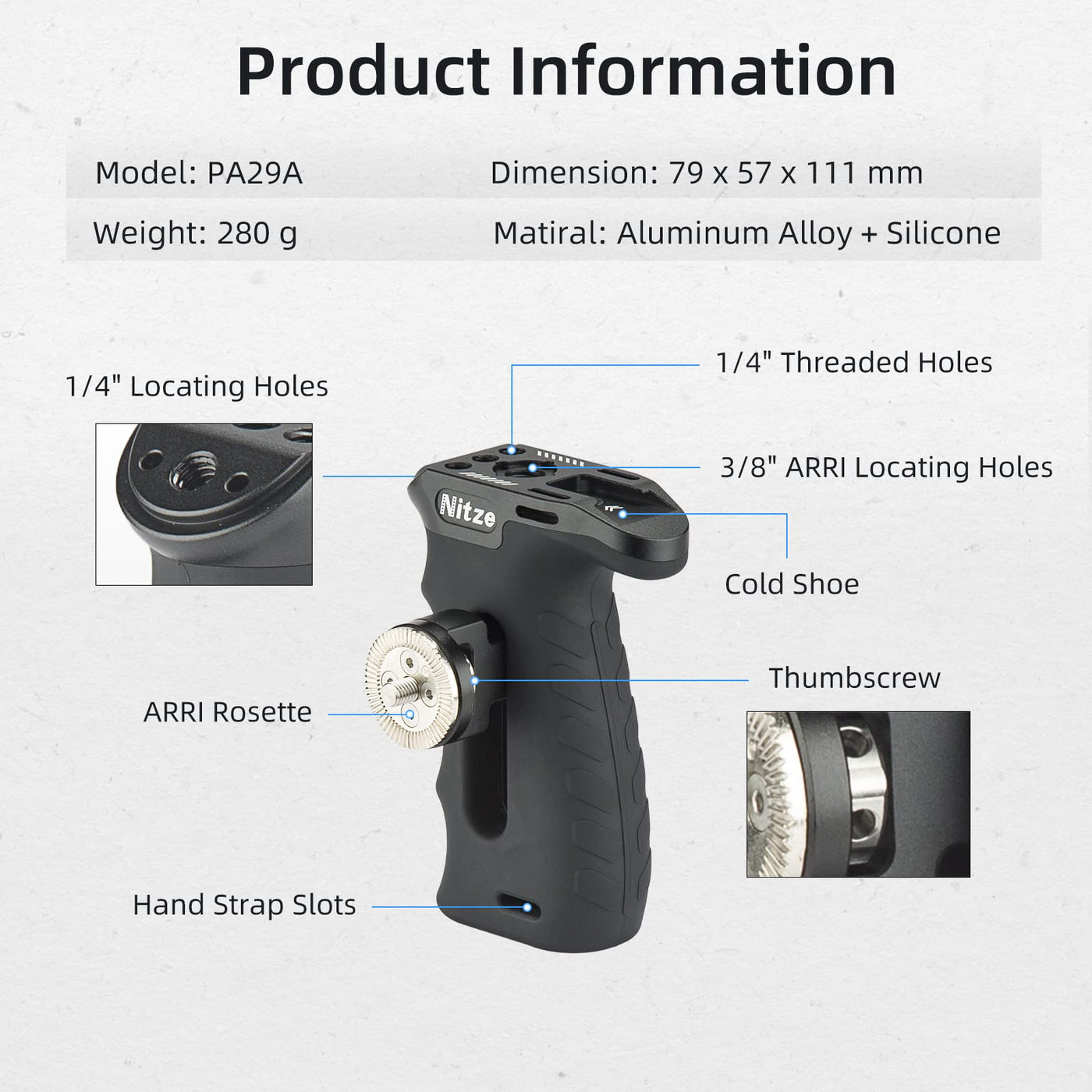 Rubberized Aluminum Side Handle: Nitze Pa29A Side Handle With Arri Rosette Is Made Of Aluminum Alloy And Covered With Rubber For More Comfortable Grip And Durability; It Can Be Mounted To Camera Or Monitor Cages