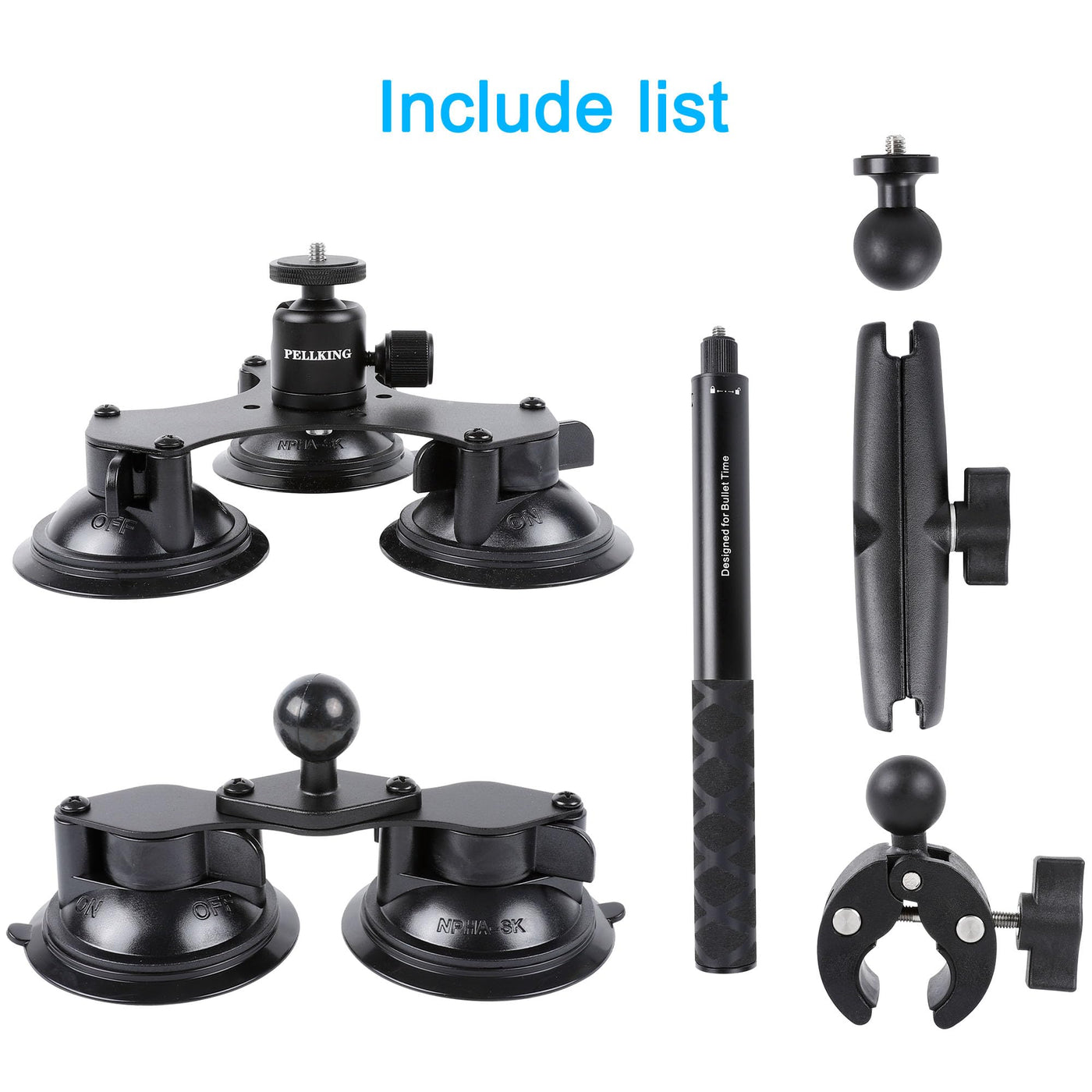 PellKing Suction Car Mount Kit for Insta360 & GoPro - 5-in-1 with 44.9-inch Selfie Stick, Black, Model 691685d8-95b