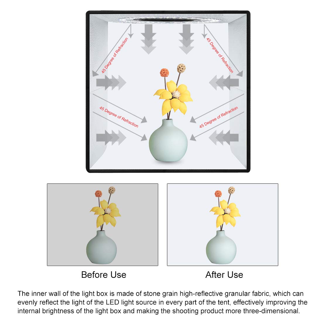 Features 1.Quick Storage, Good Three-Dimensional Effect Of The Shed. 2.Exquisite Color Box Packaging Design, Beautiful Atmosphere. Led Specification 1.Number Of Lamp Beads: 96 High-Display Lamp Beads 2.Lamp Bead Model: 2835 3.Lamp Bead Brightness: 24-26Lm 4.Positive White Temperature: 5500K 5.Dimming Range: 1%-100% 6.Dimming Gear: 10 Gears Adjustment 7.Cri: Ra More Than 97 8.Power: 1-10W 9.Voltage: 5V 10.Size: 200Mm Outside Diameter 11.Power Supply: Usb Interface Power Supply 12.Cable Length: 2 Meters Note: With 6 Pcs Background Papers, Both Sides Are Available, There Are 12 Colors Background. Package List 1.Photo Studio (A Ring Light Board) X 1 2.Soft Case X 1 3.Black/White Background Paper X 1 4.Gray/Gold Background Paper X 1 5.Yellow/Orange Background Paper X 1 6.Red/Pink Background Paper X 1 7.Blue/Purple Background Paper X 1 8.Green/Brown Background Paper X 1 9.Color Packing Box X 1