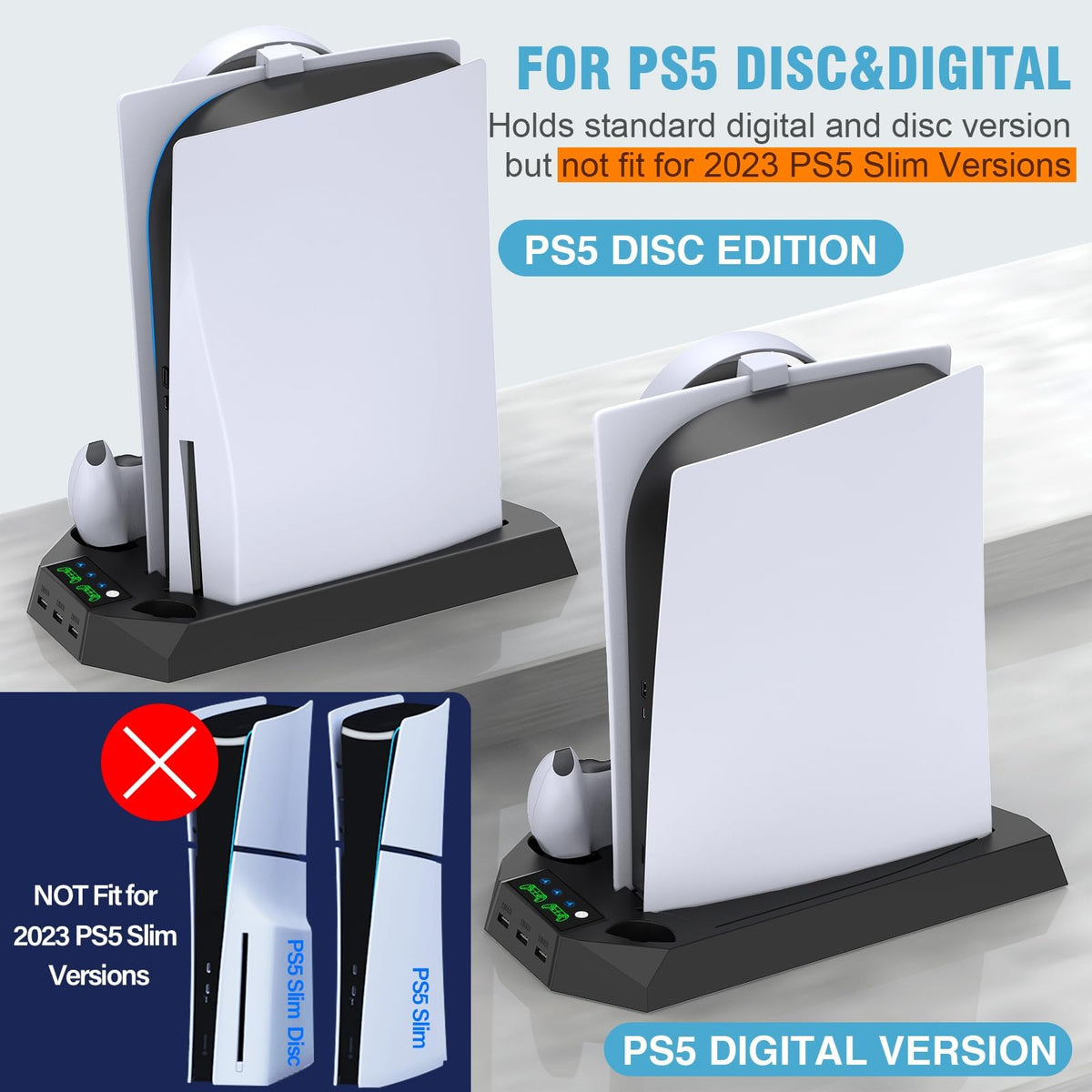 Compatibility Compatible With Playstation 5 Digital Edition Compatible With Playstation 5 Console Disc Edition Sleek And Slim Best Ps5 Accesories Replacement For Playstation 5 Consile Holder Stand, Doesnt Take Up Much Space Than The Ps5 Takes Up And The Updated Design Of Reducing Spare Game Storage To Make Your Gaming Room More Efficient, Especial For Playstation 5 Console Digital Edition Keep Playstaton 5 Cool This Ps5 Cooling Fan Keep Your Playstation 5 Consile Cool While Playing Ps5 Station Games, The Ps5 Fan Has 3 Speeds For Cooling Down The Ps5 Console With Corresponding Led Indicators To Let You Know Which Mode Youre On, And Turns On Automatically When Plystation5 On Stable Safety Screw The Ps5 Cooler Comes With A Mental Screw To Attach The Ps5 Base On Bottom To The Standheat Release Gap, Just Like The Official Ps5 Base Stand, Dont Need To Worry About Any Accidental Falling Issues Happen On The Ps5 Fan Cooling Fan 3 Usb Hubs Takes Only 1 Usb In The Pa5 Rear And Gives You 3 Usb Port Back On The Ps5 Cooling Fan, There Is An Option To Plug The Charging Cable In Your Own External Power Source To The Usb C Power Cord Which Give You The Ps5 Consols Usb Port Back. And The 3 Usb Hubs Extender Free Up Alot Of Ps5 Assecories Space On Console Ps5 Which Give The Possibility Of Having More Storage Of Ps5 Accesories Like Ps5 Headset Wireless Usb Adapter, Ps5 External Hard Drive, Camera, Playstation 5 Controller, Etc. You Dont Need To Plug/Unplug Any Ps5 Assoceries From Ps5 Console Or Ps5 Accessories Stand With Cooling Fan And Controller Charger, Great Replacement For Sony Ps5 Dock Base Effective Charger Charge Dual Ps5 Remote Even With Ps5 Skin Or Scuf On Ps5 Controller, You Dont Need To Remove Ps5 Controller Skin Every Time When Your Control Ps5 In Low Battery. Whole White Color Matches Any Kind Of Ps5 Plates, Ps5 Wall Mount Or Any Other Ps5 Controller Accessories Aesthetica