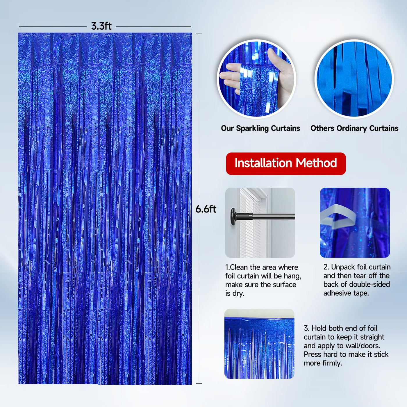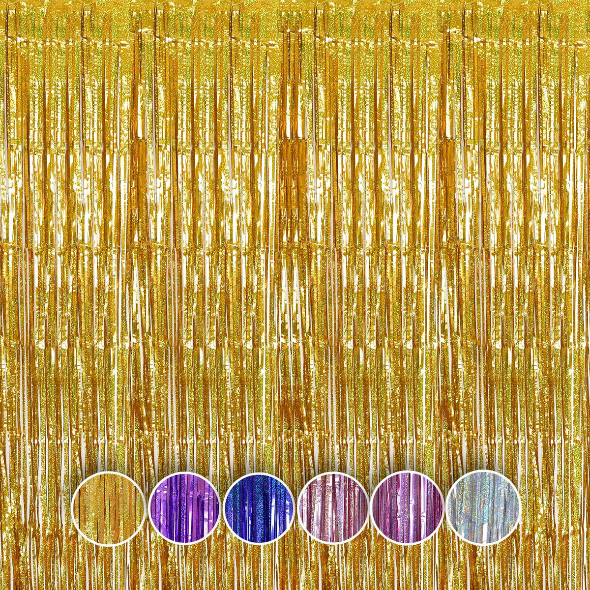 Q: How do I install the gold foil fringe curtains?A: Installation is simple with the self-adhesive tape on the back of each metallic tinsel party streamer. Just peel off the tape and stick the foil curtain to any clean, flat surface such as walls, doors, windows, or tables for an effortless setup.