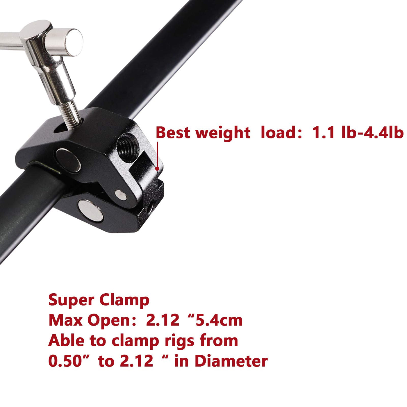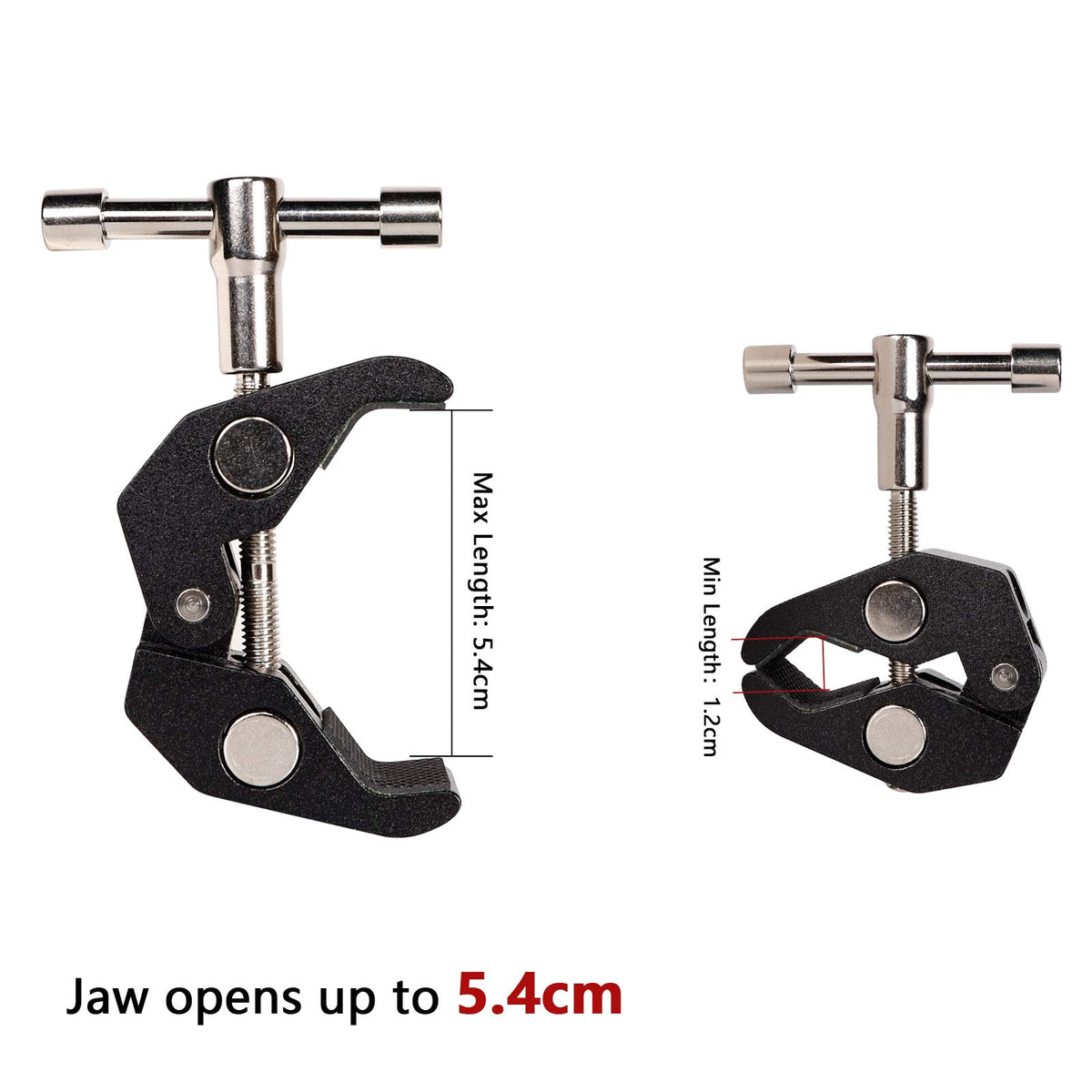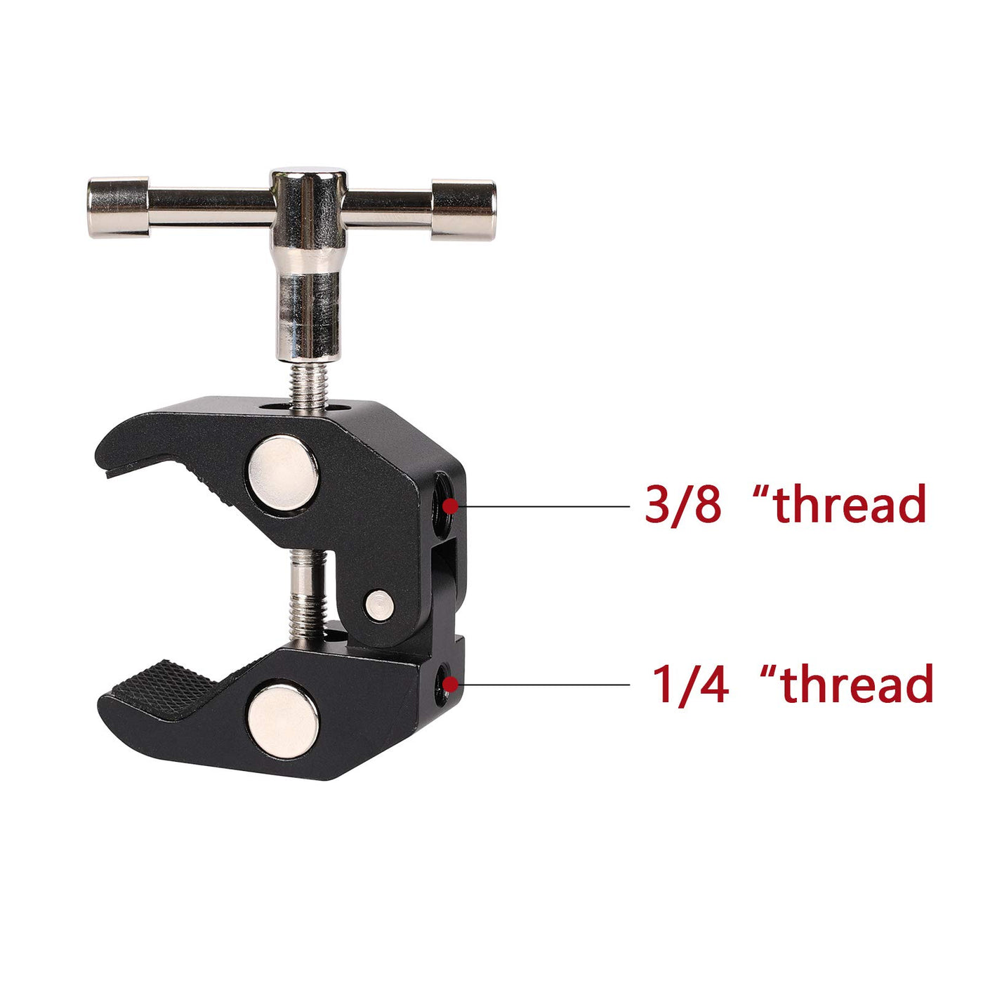 Product Description The Magic Arm Clamp Is Versatile, It Can Mount Onto Any Shaped Body Like Cameras, Rods, Lights, Hooks, Shelves, Cross Bars, Etc. The Super Clamp Has 1/4 Threaded Hole And 3/8 Threaded Hole, It Can Attach More Accessories. The Jaw Can Be Adjusted From Min 12Mm To Max 54Mm. Anything Within This Range Can Be Clamped. Non-Slip Rubbers On The Inner Side Provides Strength And Stability.