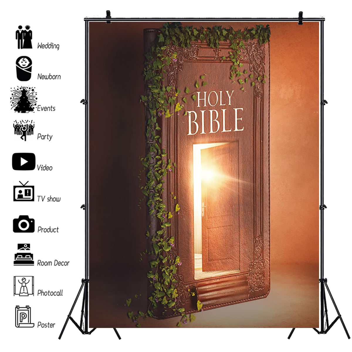 Q: What is the size of the Renaiss Holy Bible Backdrop?A: The Renaiss Holy Bible Backdrop measures 6x8ft (1.8x2.5m, or 72x96 inches), making it ideal for various photo shoots and events.