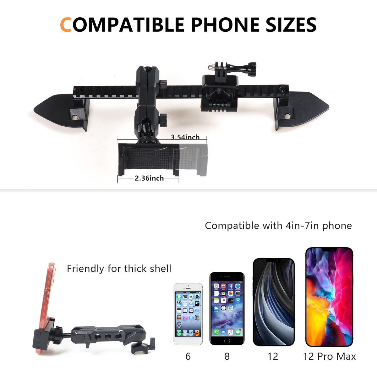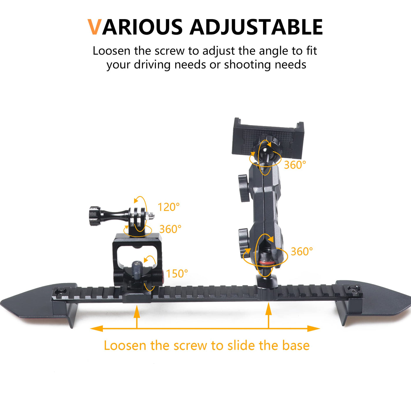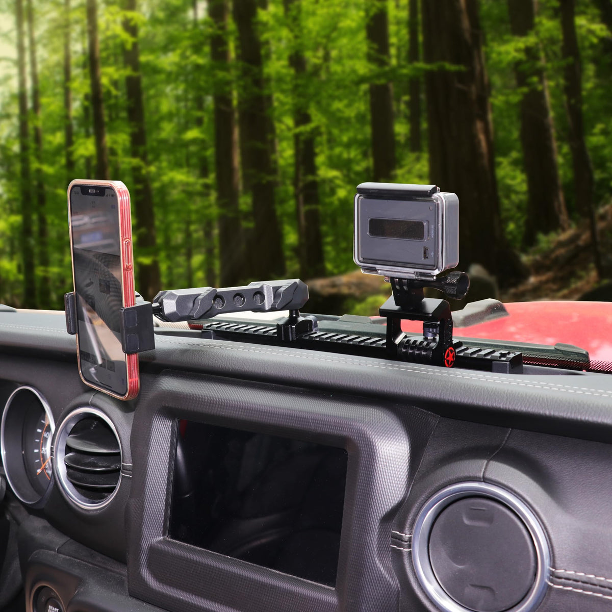 Rerpro Dash Mount 2 In 1 Phone And Action Camera Holder For 2018-2023 Jeep Wrangler Jl Jt Application Compatible With 2018-2023 Jeep Wrangler Jl 2020-2023 Jeep Gladiator Jt 2/4 Door Dash Mount Not For Wrangler Jl 4Xe, Oil-Electric Hybrid Version, Wrangler Unlimited Willy Edition Jl, And Sahara Unlimited Compatible With 4In - 7In Phones. Universal Fit For Most Phones Compatible With Akaso/Campark/Crosstour/Apeman Action Camera Compatible With All Gopro Models, Such As For Gopro Hero 9, 8,7,5 4, Session, For Gopro Max, Etc Compatible With Xiaomiyi/4K, Ld4000/6000, Insta360 One R, Dji Osmo Action, Sj 5000/6000/7000 What You Get 1X Jl 2 In 1 Phone & Camera Holder Mount 1X Screwdriver 360 Adjustable Jl Phone Holder Adopts A 360 Adjustable Ball Holder And The Double 360 Adjustable Phone Holder Arm Heads. 360 Adjustable Jl Action Camera Holder Applies A 120 Adjustable Bolt And A 240 Adjustable Base. Slide Rail Mobile The 2 In 1 Jl Jt Dash Mount Phone & Action Camera Holder Have A Slide Rail Mobile Design, Simply Loosen The Screws To Slide The Bases Of Phone Holder & Camera Holder Back And Forth.