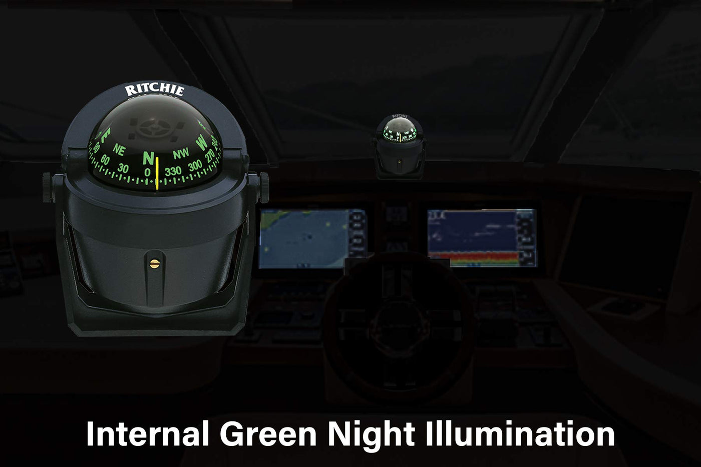 Explorer Compass, Mfg# B-51, Bracket Mount, Black Housing, 2. 75'' Direct Reading Black Dial, Moveable Sun Shield, Green Illumination, Compensators, 5 Year .