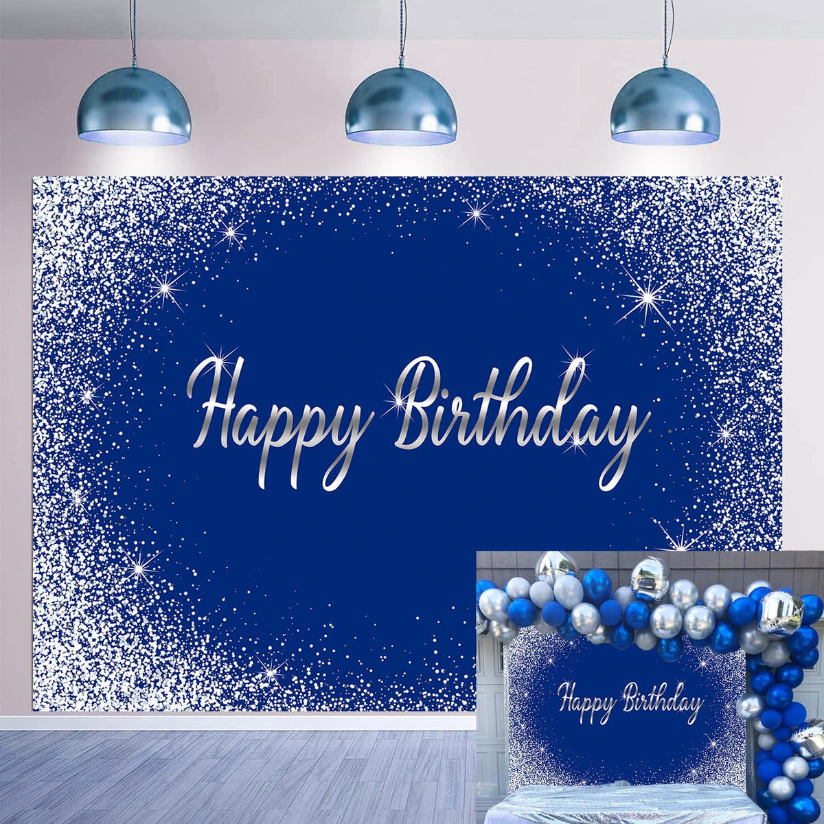 Royal Blue Happy Birthday Backdrop 7X5Ft Glitter Blue Silver Dot Photography Background Birthday Party Decoration Banner Cake Ta