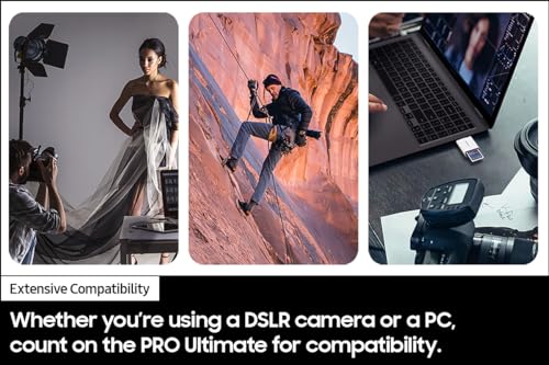 Q: Is the SAMSUNG PRO Ultimate compatible with DSLR and mirrorless cameras?A: Yes, the SAMSUNG PRO Ultimate Memory Card is compatible with DSLRs, mirrorless cameras, and PCs, providing versatile storage solutions for various devices.