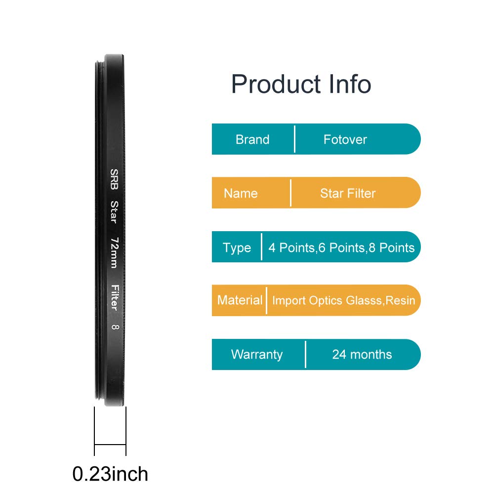72Mm Star Filter Kit -The Star Filter Can Make Every Bright Spot In Photo Producing Star-Shaped Flash-Like Dazzling Effect.The Brighter The Spot, The More Pronounced The Star Effect.Perfect For Night Scenery, Gemstones, Glassworks, Metal Works Photography. -This Universal Star Filter Compatible With Nikon Sony Olympus And Other Camera. -It Can Be Adopted As Long As There Are Point Light Source Or Highlights In Your Scene. Package 1 X 72Mm 4 Points Star Filter 1 X 72Mm 6 Points Star Filter 1 X 72Mm 8 Points Star Filter 1 X 72Mm Centre Pinch Lens Cap 1 X Microfiber Lens Cleaning Cloth. 1 X 3 Slot Nylon Filter Pouch Warranty We Offer One Year Warranty And Life-Time After-Sales Service,So You Meet Any Problem,Please Feel Free To Contact Us.
