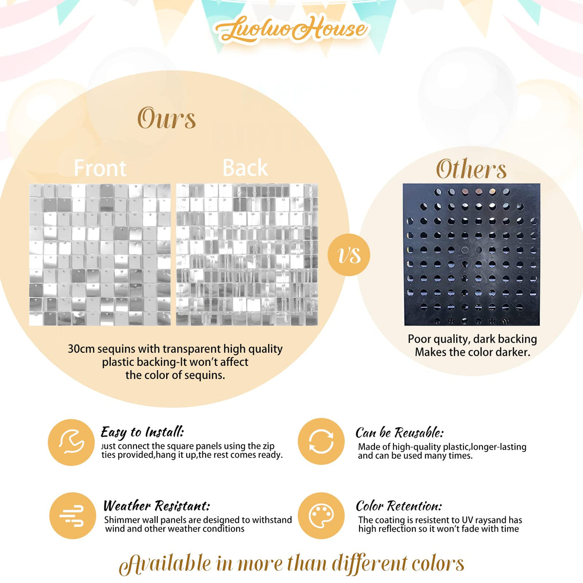 ??????Luoluohouse Shimmer Wall Backdrop Panel??????Each Panel Is 12 Inch (L) X 12 Inch (W) X 0.75 Inch (H). Each Box Includes 24 Individual Panels. Creating Large Scale Backdrops And Displays Could Not Be Any Easier!These Premium Sequin Panels Are Perfect To Decorate Any Special Event, Including Weddings, Bridal & Baby Showers, And Birthdays.Enjoy Your Time!!!Our Sequin Panels Are Durable, And Can Be Used Multiple Times For Other Occasions. Can Be Used For Outdoor And Indoor. To Attach Multiple Panels Together, It Is Best To Secure Them With Zip Ties.Live Sequin Panel Wall Size For Custom Backdrops6 Ft By 4 Ft = 24 Panels(1 Box)6 Ft By 6 Ft = 36 Panels8 Ft By 6 Ft = 48 Panels(2 Boxes)10 Ft By 6 Ft = 60 Panels8 Ft By 9 Ft= 72 Panels(3 Boxes)7 Ft By 12 Ft= 84 Panels8 Ft By 12 Ft = 96 Panels(4 Boxes)12 Ft By 9 Ft =108 Panels10 Ft By 12 Ft = 120 Panels(5 Boxes)Please Measure The Size Of Decoration Before Purchase.Thank You For Choosing Our Shimmer Wall Panels As Part Of Your Event Decorations.Incuded Backdrop Curtains,Gold Sequin Backdrop,Shimmer Wall Panel,Shimmer Wall Panels Sequins Wall Panels,Photo Booth Backdrops,Shimmer Curtains,Glitter Backdrop,Rose Gold Curtain Backdrop,Baby Shower Backdrop,Stage Background,Advertising Signs Panels,Decoration Anniversary Engagement.