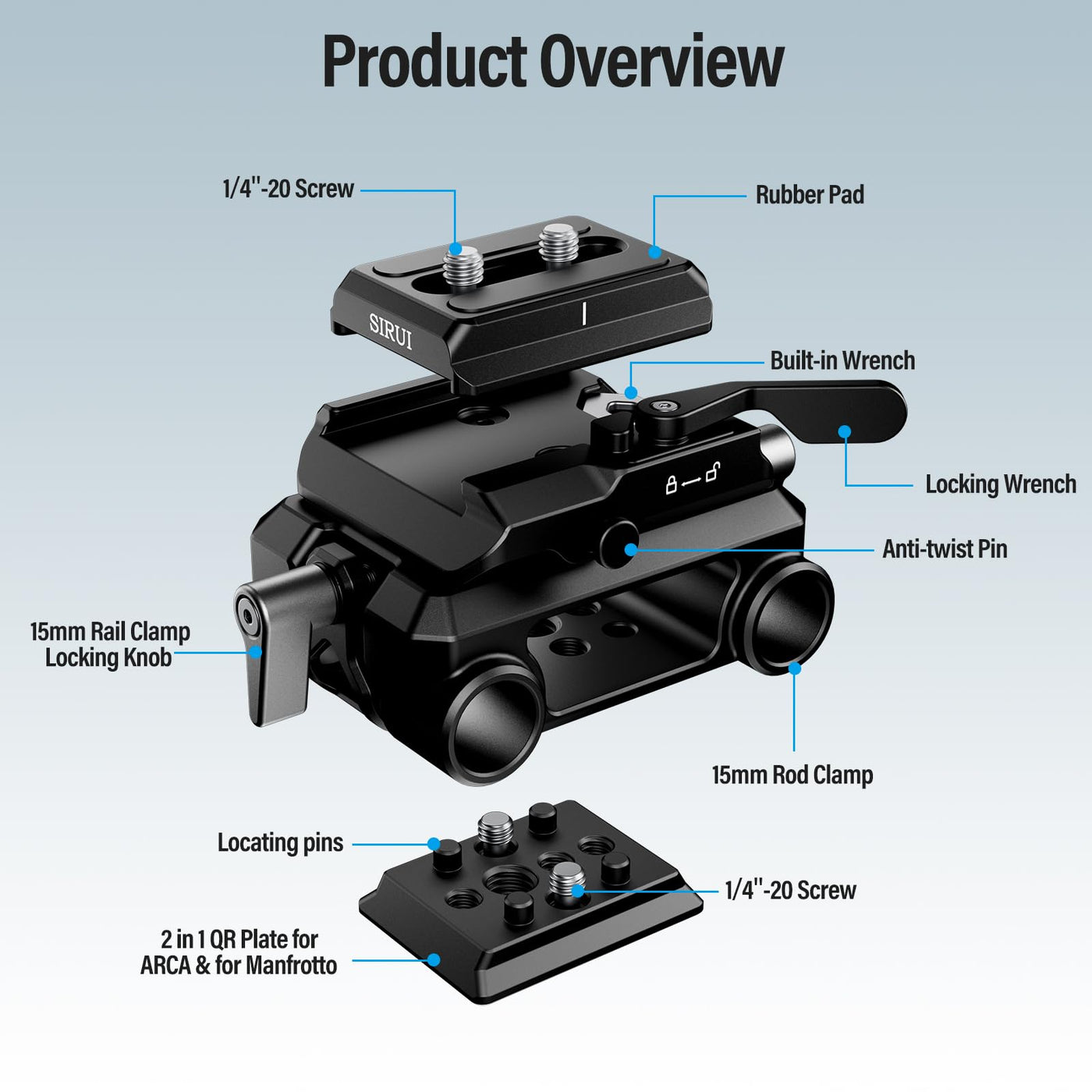 Sirui 15Mm Rail Support System With Quick Release Plate, Camera Baseplate With Dual 15Mm Rod Clamps For Tripod, Shoulder Rig, Follow Focus, Am Qa Lr