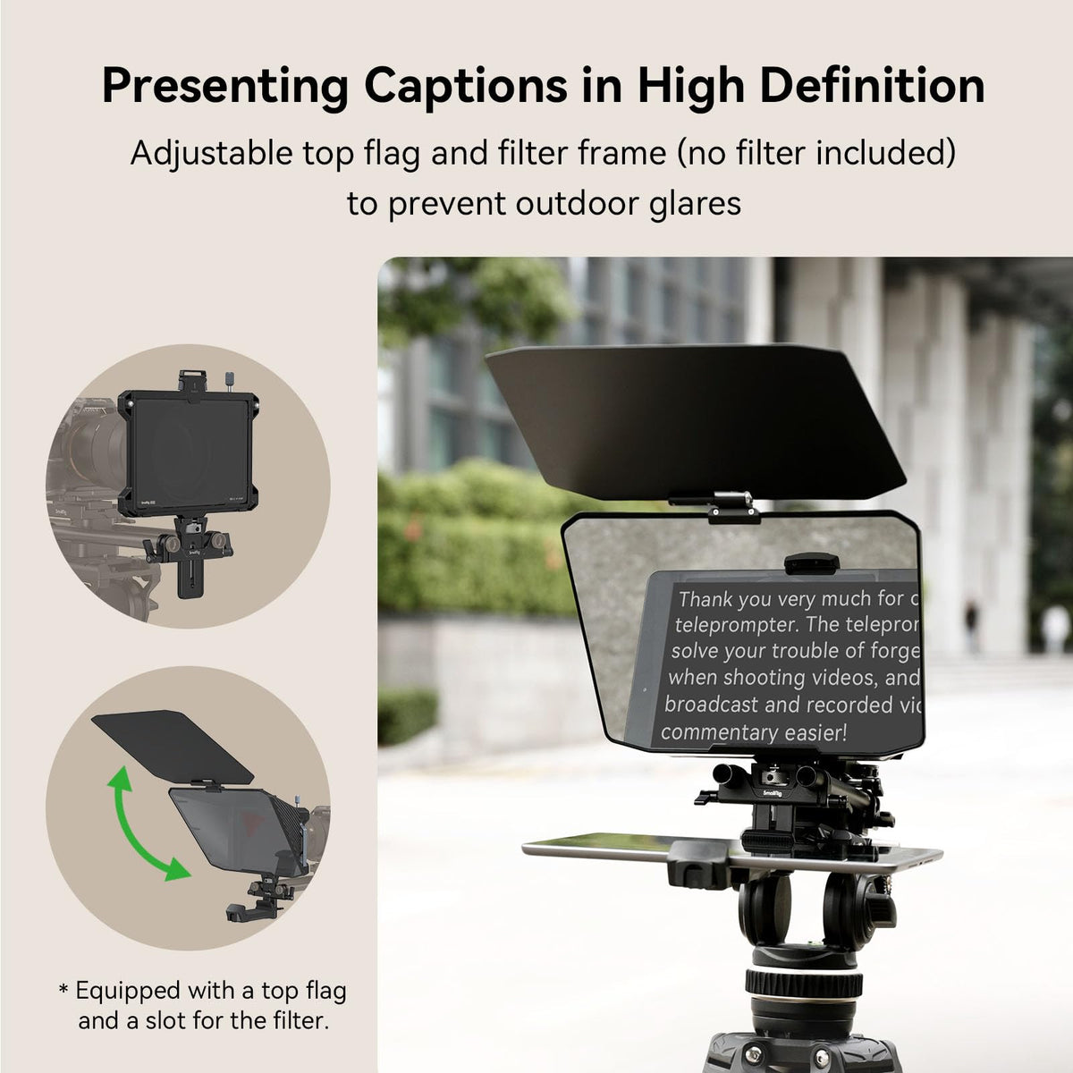 Smallrig Multifunctional Teleprompter 3646 Key Features: 1.Compatible With 15Mm Rail Support System To Protect The Lens Mount 2.Adjustable Top Flag And Filter Prevent Outdoor Glares 3.App Supports Pdf, Picture, Word, Txt 4.No Vignetting When Focal Length =22Mm; Reflected Text Readable Up To 5M Away (With A 11'' Tablet) Note: 1. A 15Mm Rail Support System Is Needed To Protect The Lens Mount 2. The Silicone Lens Hood Supports Lenses Up To F95Mm 3. Recommended Size Of Tablet: =11'' 4. Incompatible With Smartphone 5. Only Supports Lens With Focal Length =22Mm 6. The App, Called Smallgogo, Is Available In Apple Store And Android Market 7. Please Check The Accuracy Of Text Recognition By The App Compatibility: 1: Universal F15Mm Rod 2: For Ios And Android 3: Universal 4 X 5.65'' Filter In The Box: Top Flag X 1 Lens Hood X 1 4 5.65'' Filter Frame X 1 Clamp-On Back 95Mm X 1 Silicone Cover For The Lens X 1 Stand For Ipad X 1 15Mm Lws Support For The Ipad Stand X 1 Wireless Controller X 1 Cleaning Cloth X 1 Carrying Bag X 1 User Manual X 1 Specifications Product Dimensions: 194.0 X 260.0 X 244.0Mm Package Dimensions: 294X 266 X 149Mm Product Weight: 898.0 5.0G Package Weight: 1520 5.0G Material(S): Al6061, Abs+Pc, Glass